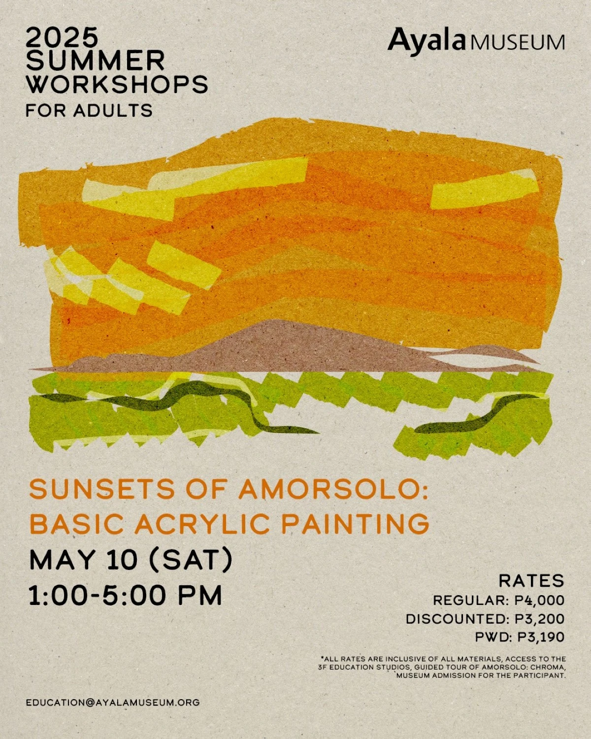 This summer, explore the art of light and color through Ayala Museum’s Amorsolo: Chroma-inspired adult workshops. Learn the basics of acrylic painting with Mary Rose Gisbert. Perfect for beginners or anyone wanting to refine their skills, this session offers a fun and artistic way to connect with the legacy of the country’s first National Artist. Fee: P4,000 (includes an art kit). Learn more