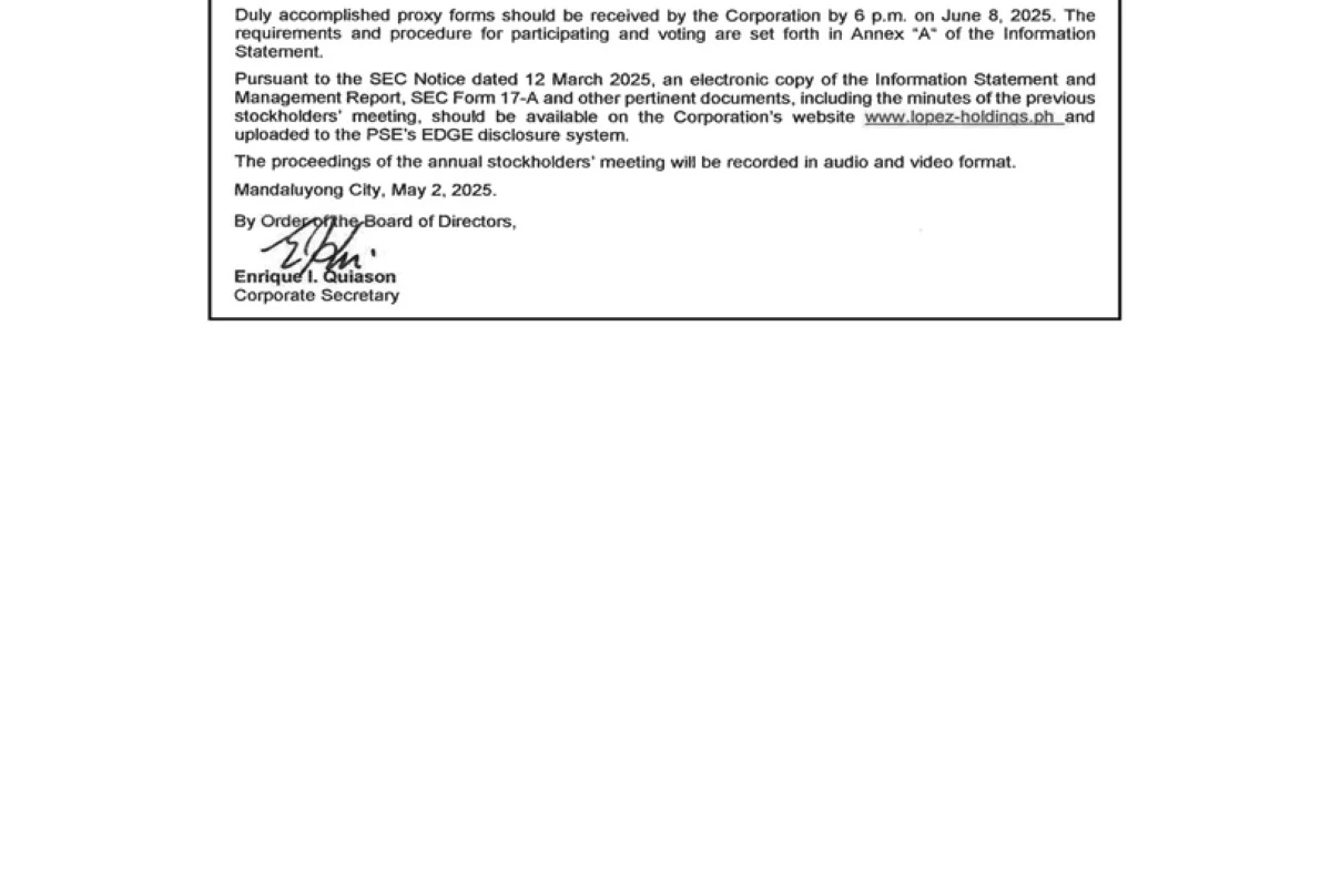 - The Lopez Holdings Corporation will be holding its annual meeting of stockholders on June 19, 2025. Time, venue, eligibility, and details to participate are listed here.