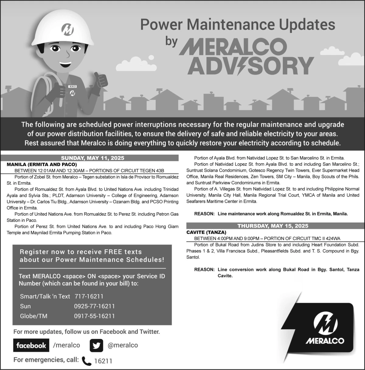 MERALCO exerts all efforts to restore electric service as scheduled. However, there are instances when due to unavoidable circumstances, restoration may extend beyond the published schedule.