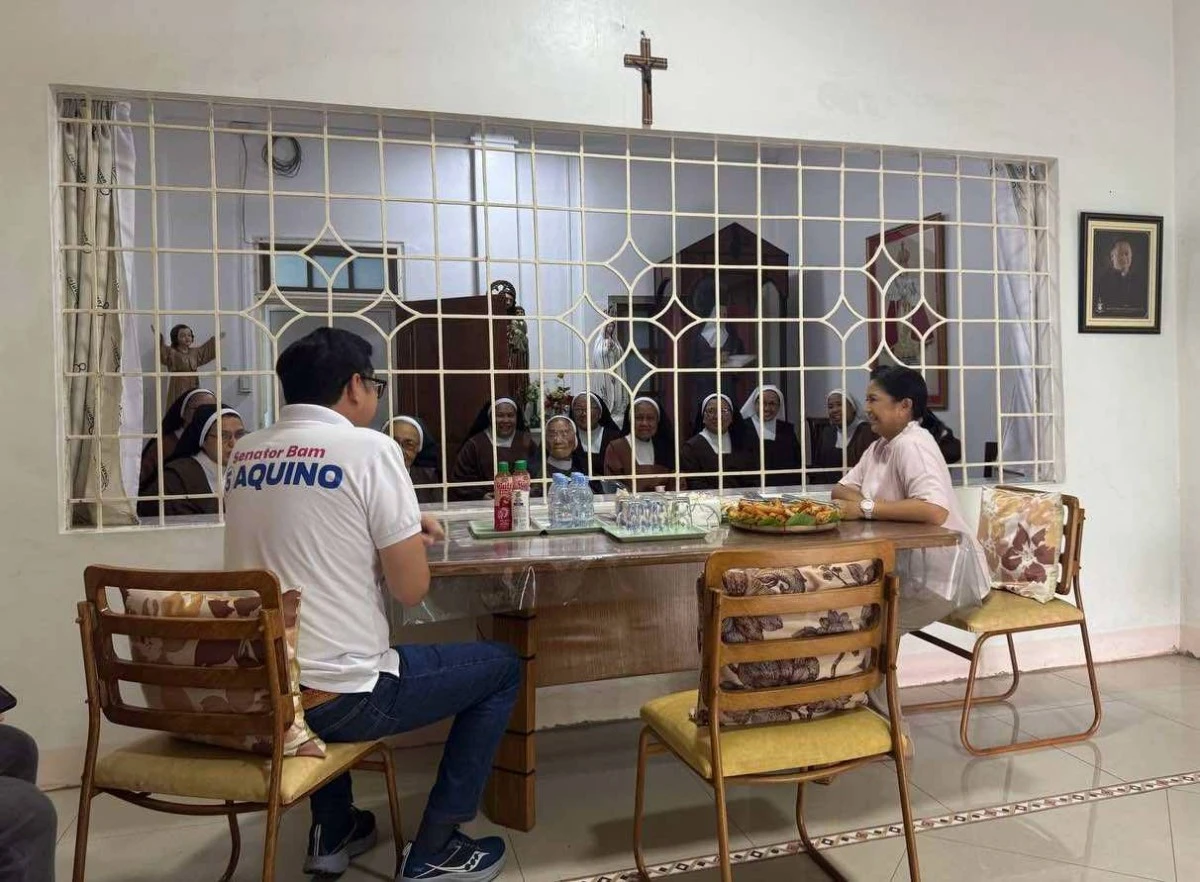 Bam Aquino is accompanied by former vice president and Naga mayoral candidate Leni Robredo during his visit to the Our Lady of Mt. Carmel Monastery on Saturday, May 10, 2025. (Bam Aquino Media Bureau)