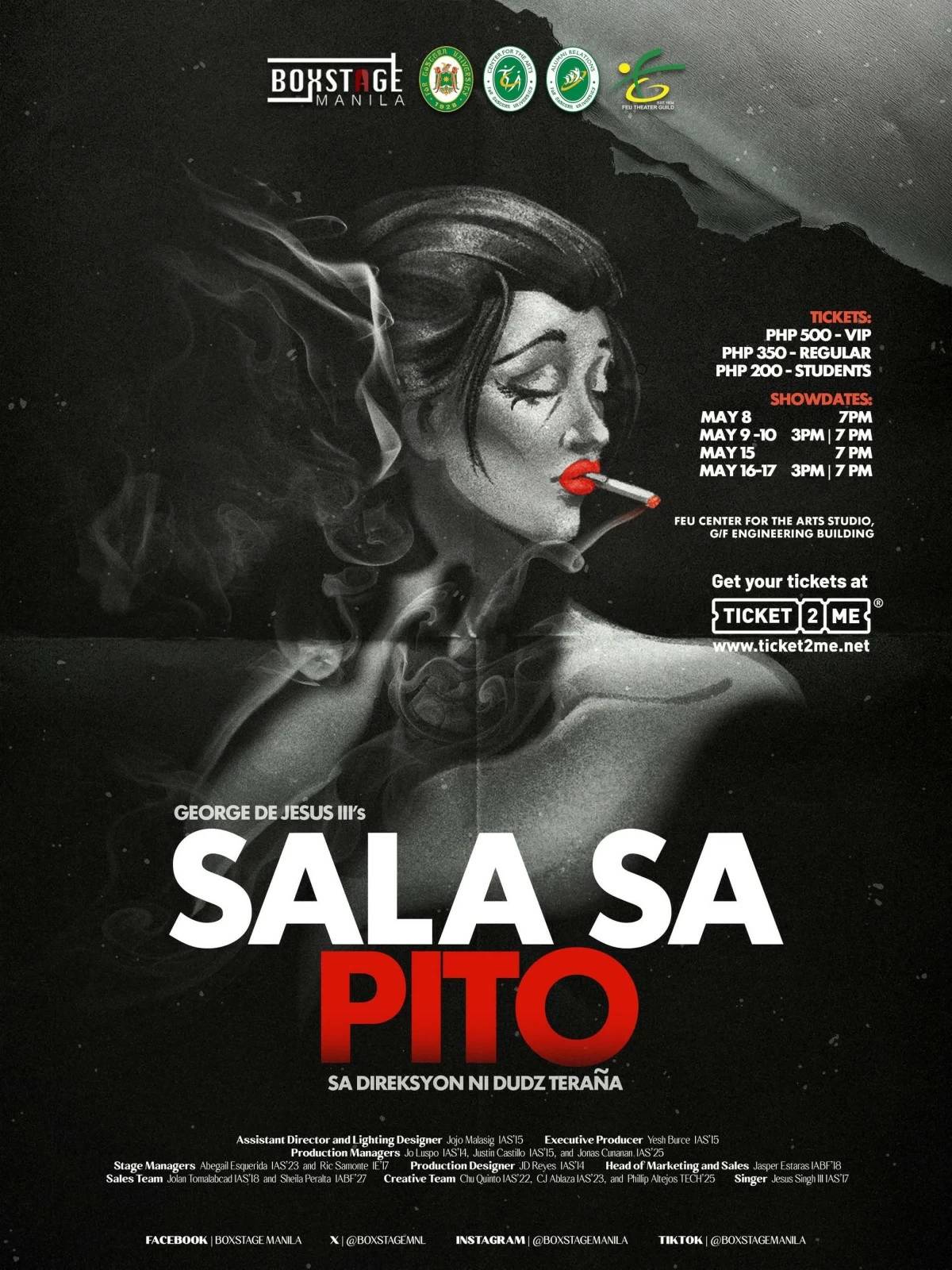 Performances will take place at the FEU Center for the Arts Studio in Manila. The black box theater is designed to create an intimate and immersive connection between the audience and the story.