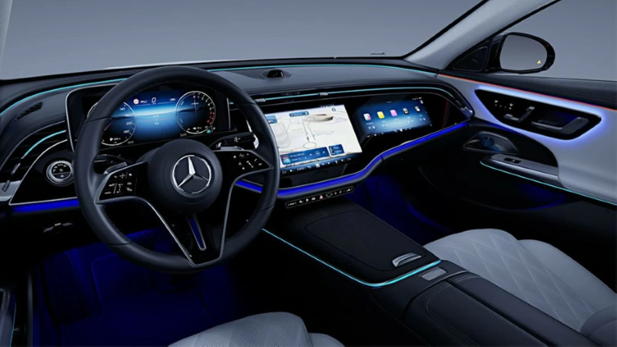 Inside, the E 350e features the MBUX Superscreen system—a 14.4-inch central touchscreen paired with a 12.3-inch passenger display under a single glass panel—enhanced by a visual shield for safe usage on the move. Adding further appeal is a Burmester 4D surround sound system with 17 speakers, four exciters, and Dolby Atmos capability, offering an immersive acoustic experience.