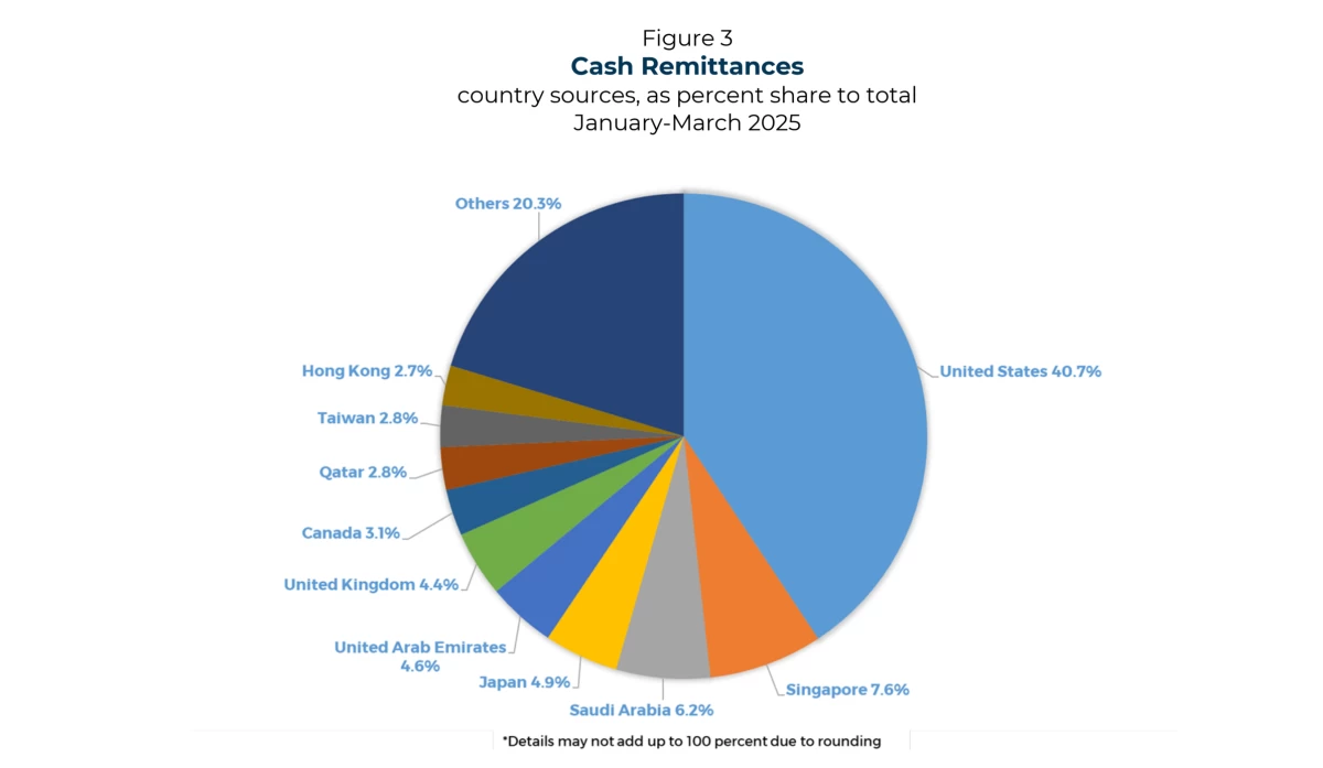 By source, the US remained the top source of cash remittances in the first quarter at 40.7 percent, followed by Singapore (7.6 percent), and Saudi Arabia (6.2 percent).