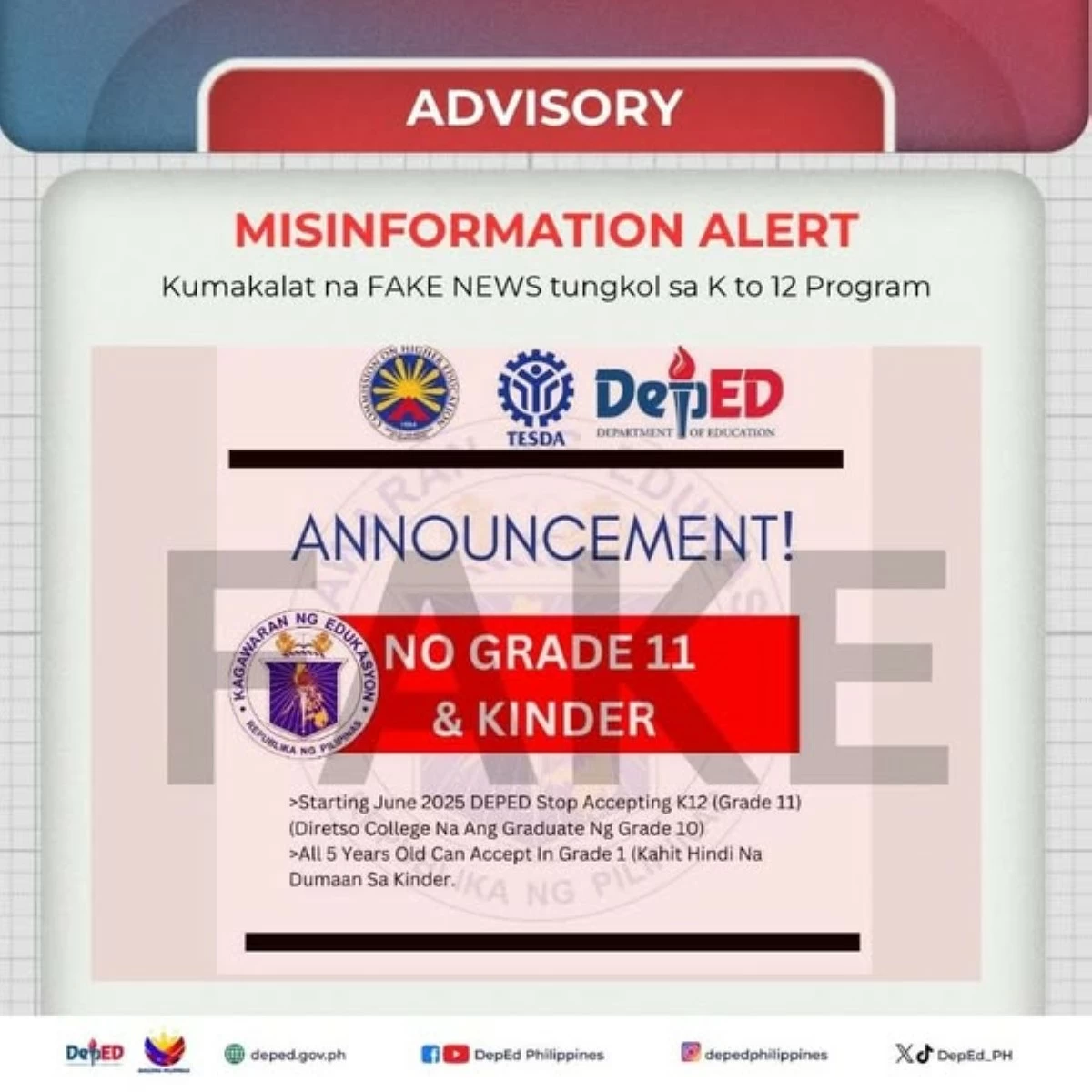 “Fake news ang kumakalat na post sa social media tungkol sa pagtanggal ng K to 12 program sa darating na SY 2025–2026 (A false post is circulating on social media claiming that the K to 12 program will be removed in SY 2025–2026),” DepEd said in a public advisory.