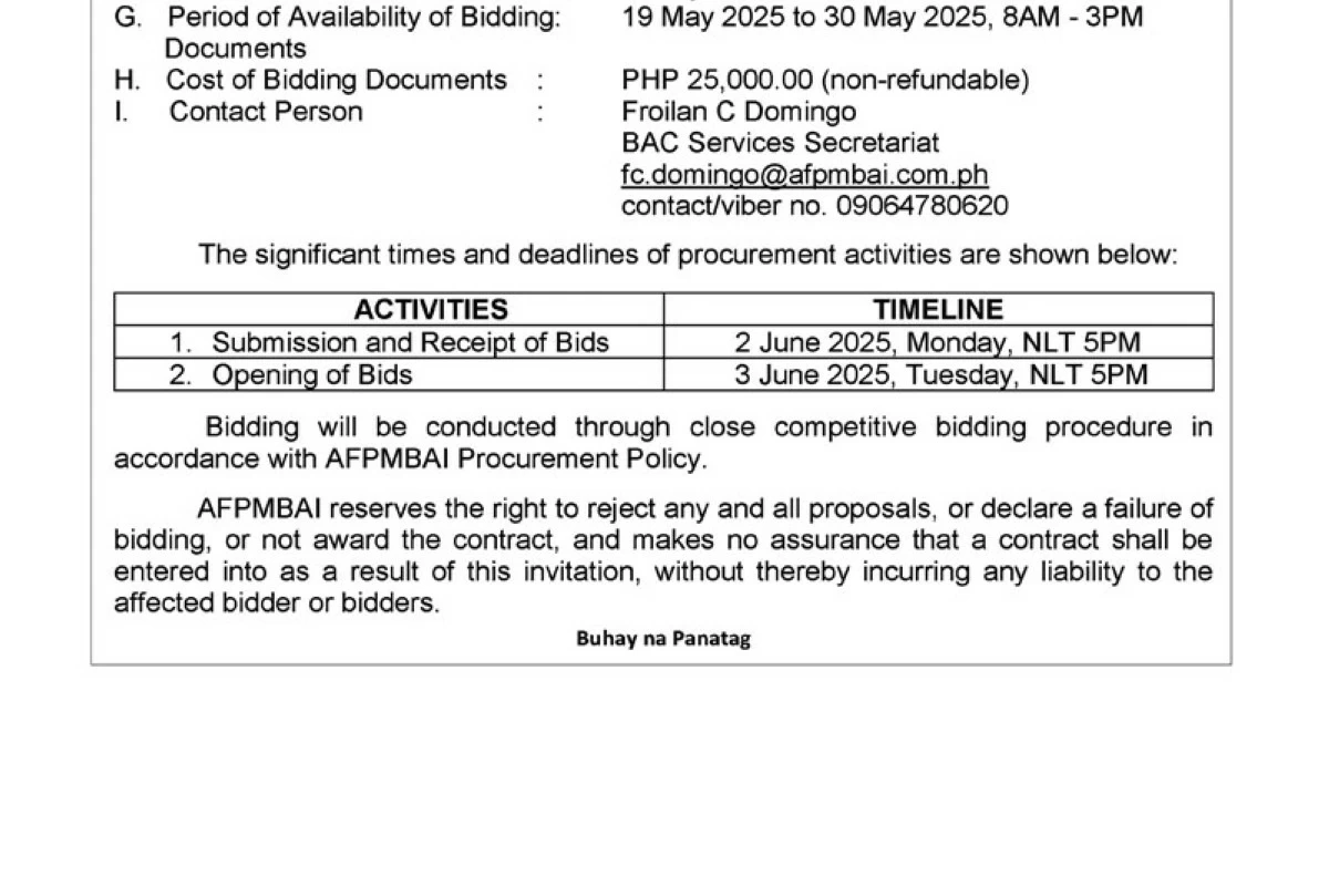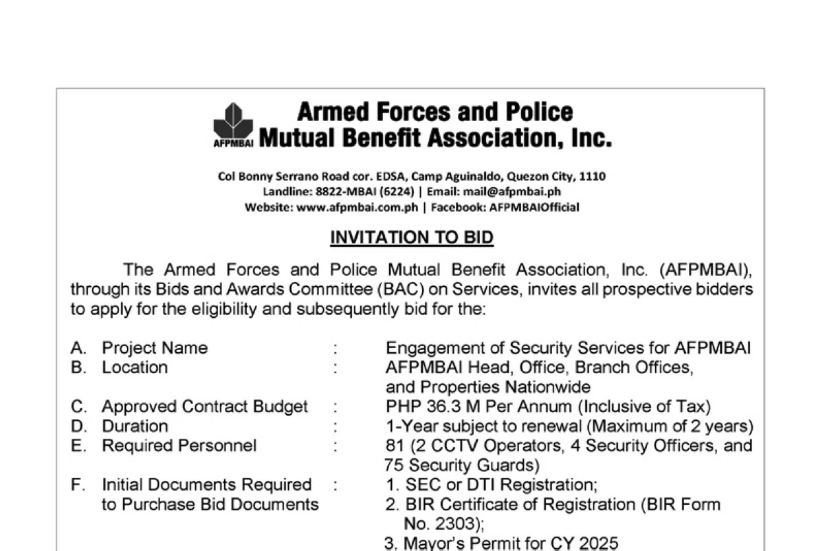The Armed Forces and Police Mutual Benefit Association, Inc. (AFPMBAI), through its Bids and Awards Committee (BAC) on Services, invites all prospective bidders to apply for the eligibility and subsequently bid for the Engagement of Security Services for AFPMBAI.
