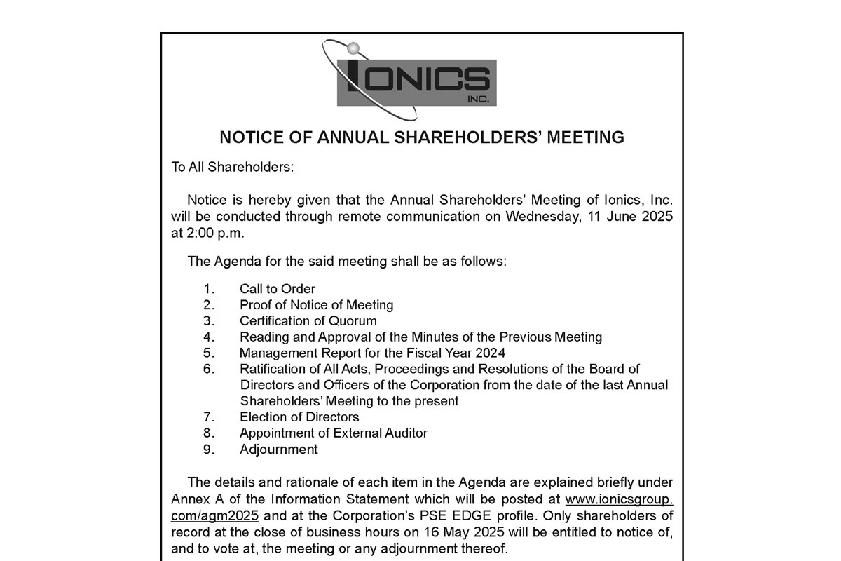 Shareholders who wish to attend the meeting should register using the Company’s registration portal at www.ionicsgroup.com/agm2025 on or before 4 June 2025. Stockholders who cannot attend the meeting may designate their authorized representative by submitting a signed proxy form via email to [email protected] no later than the close of business hours on 5 June 2025.