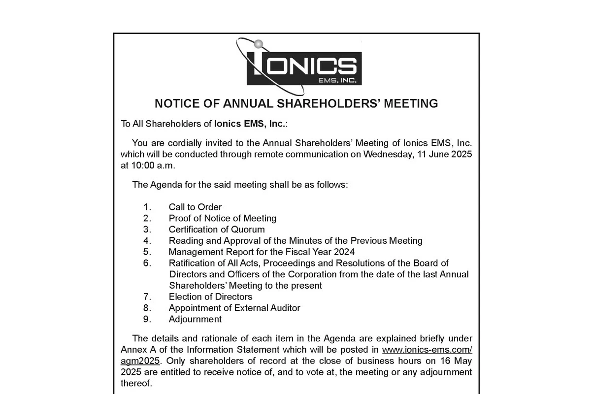 Ionics EMS, Inc. will be conducting its annual meeting of stockholders on June 11, 2025, Wednesday at 2:00 PM via remote communication.