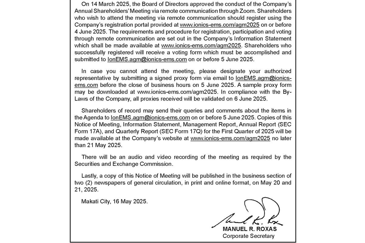 Shareholders who wish to attend the meeting via remote communication should register using the Company’s registration portal provided at www.ionics-ems.com/agm2025 on or before 4 June 2025. Stockholders who cannot attend the meeting may designate their authorized representative by submitting a signed proxy form via email to [email protected] before the close of business hours on 5 June 2025.
