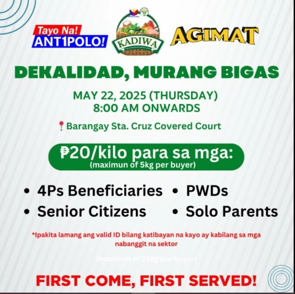 - Only the target beneficiaries may avail the budget-friendly rice. They are the 4 Ps beneficiaries, senior citizens, solo parents, and persons with disability, who are residing in Antipolo City or any part of Rizal Province.