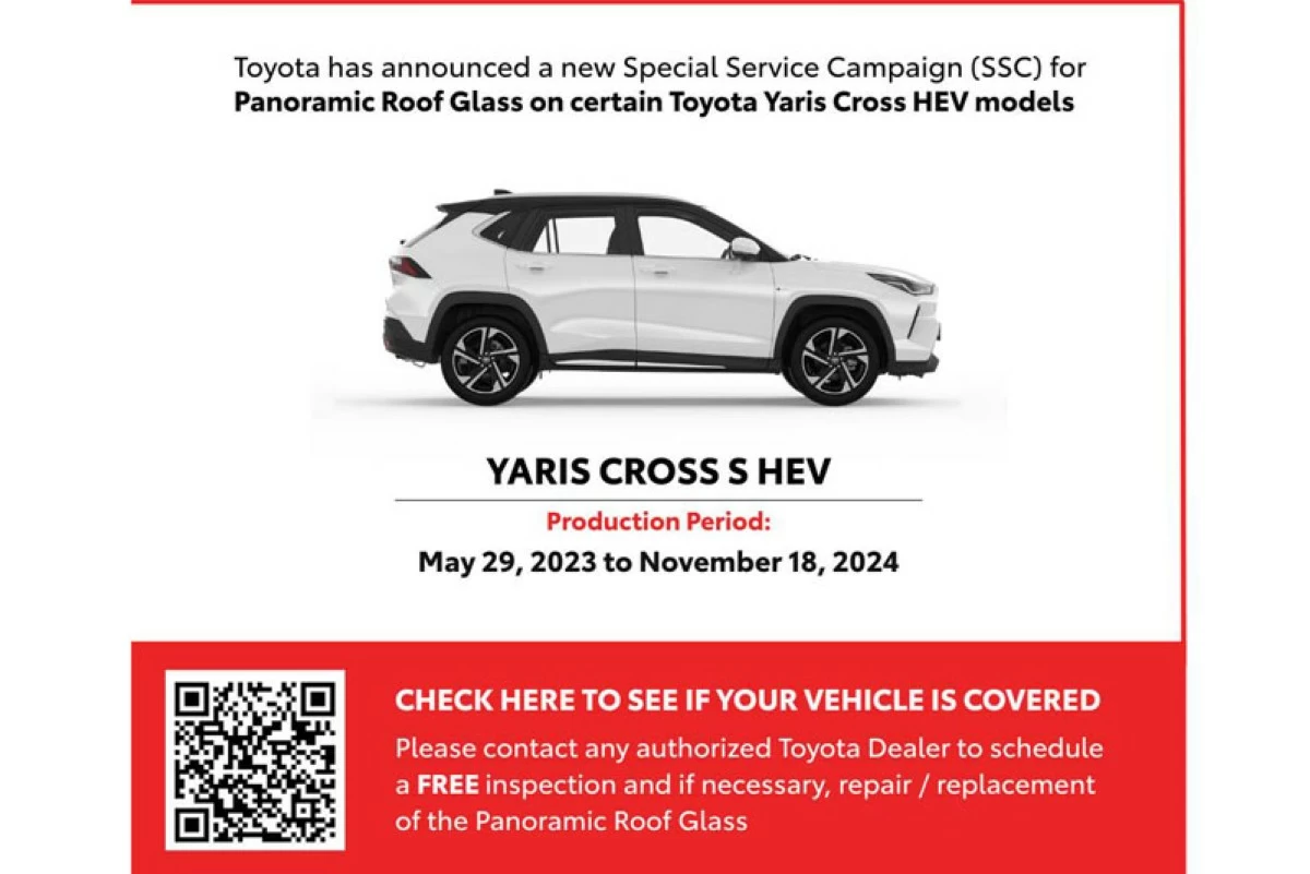 - Toyota Motor Philippines (TMP) will repair a potential defect in the panoramic roof glass of a specific batch of its Yaris Cross Hybrid Electric Vehicle (HEV) models for free. Scan the QR Code below to see if your unit is affected.