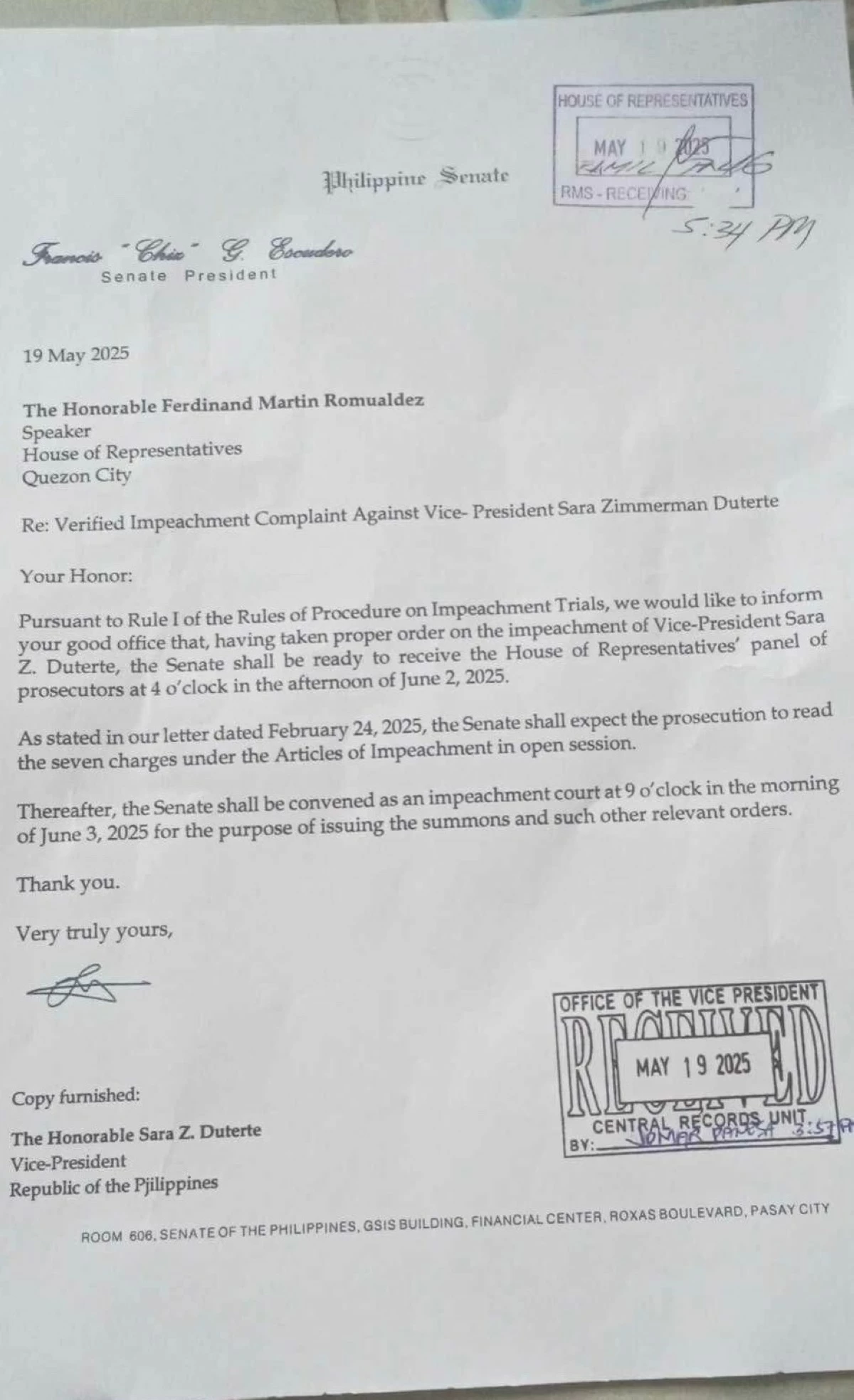 In a letter dated to House Speaker Martin Romualdez, Senate President Francis “Chiz” Escudero said the Senate will receive the House of Representatives’ panel of prosecutors at 4 p.m. on June 2, 2025.