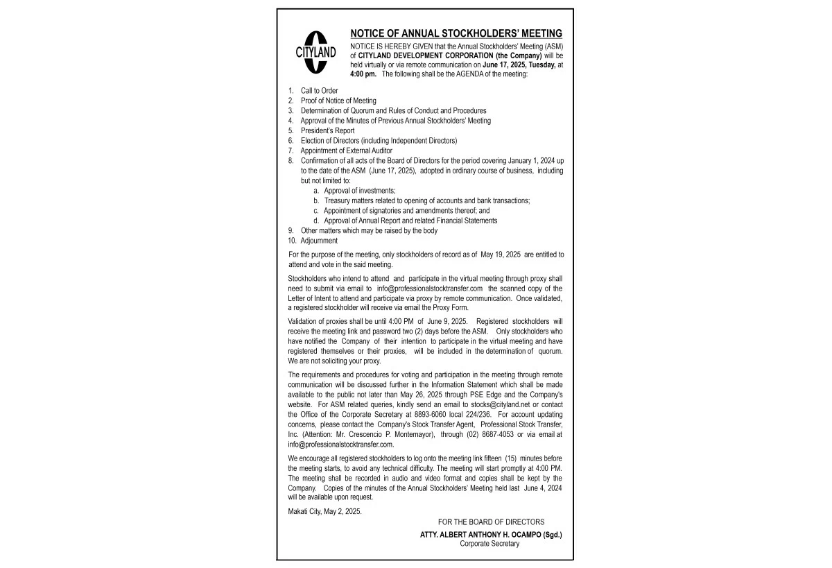 Cityland Development Corporation will be conducting its annual meeting of stockholders on June 17, 2025, Tuesday, at 4:00 P.M. virtually or via remote communication.
