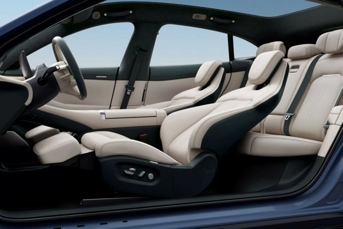 Once inside, the cabin features a "Dual-Zone Surround Luxury Cabin" philosophy, which masterfully blends three core experiences into one harmonious space. The cabin features dual zero-gravity front seats and power-adjustable rear seats. The cabin is made with eco-conscious materials, with 100% soft-touch surfaces throughout high-contact areas. The seats are upholstered in Nappa leather with a finely pebbled rock-grain texture.
