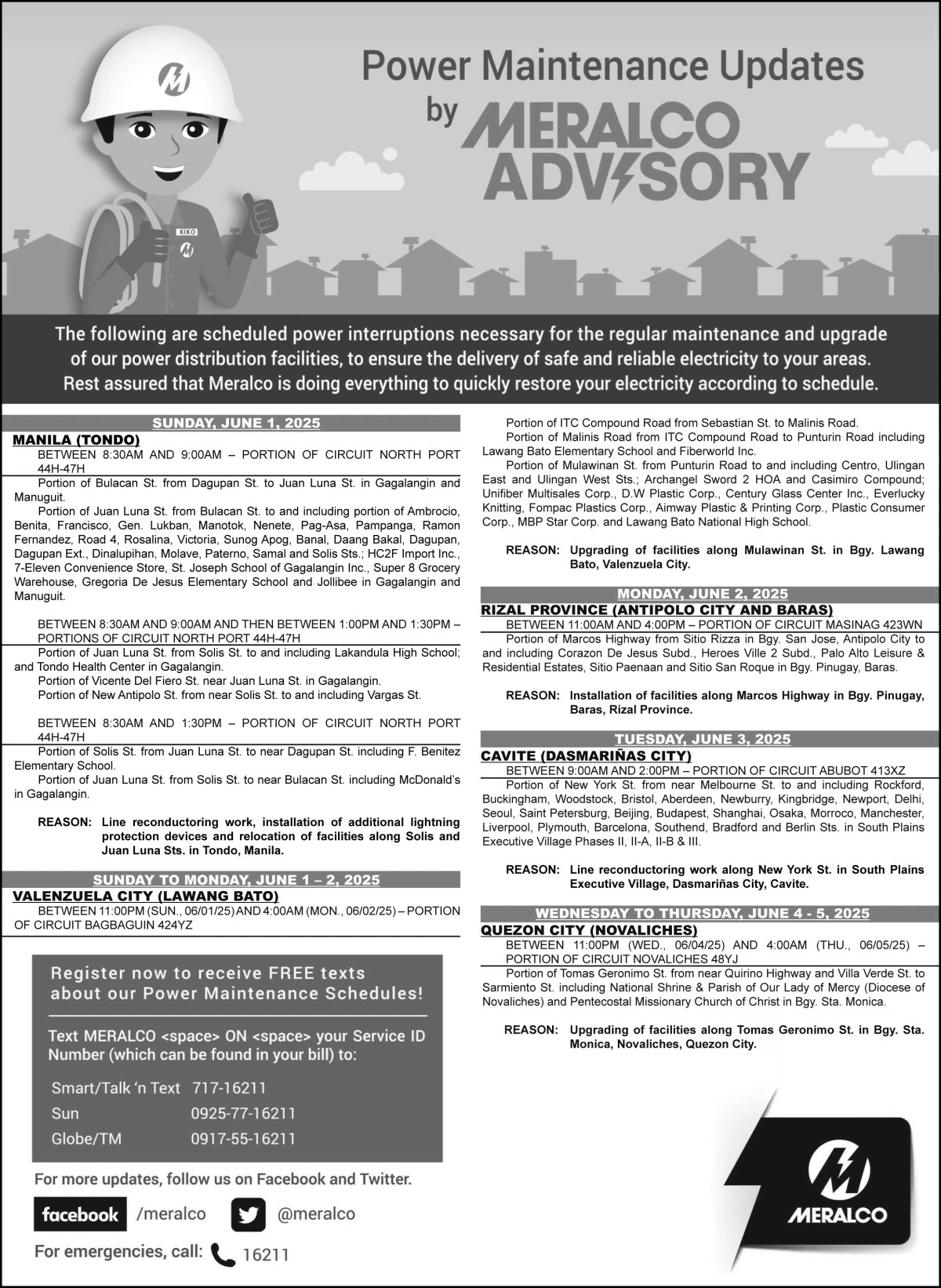 To carry out necessary maintenance and upgrading works on various MERALCO distribution facilities, electric service will be temporarily interrupted on the following dates and places: