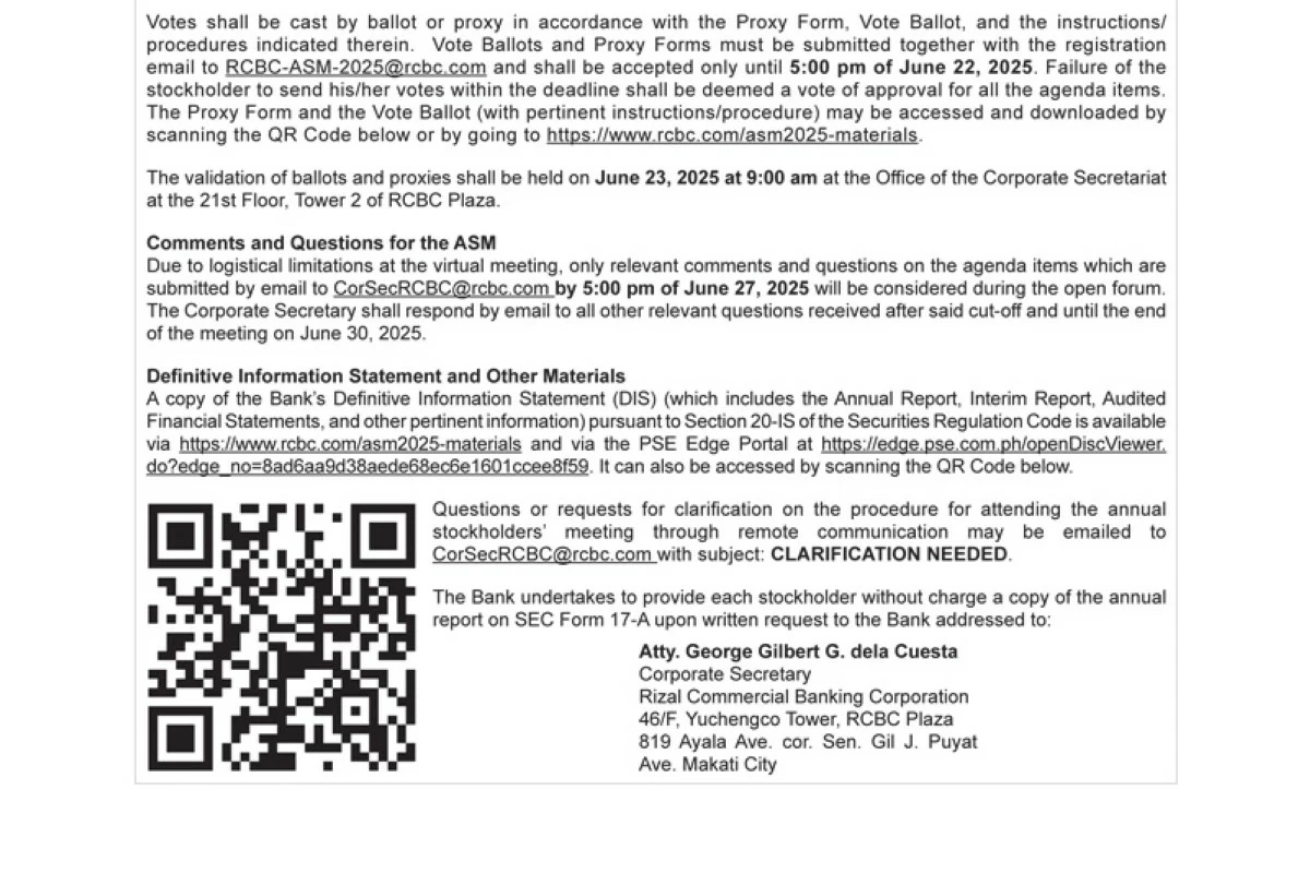 Questions or comments on the agenda must be submitted by email to [email protected] by 5:00 P.M. on June 27, 2025, to be addressed during the open forum. The Definitive Information Statement and all related materials are accessible via https://www.rcbc.com/asm2025-materials and the PSE Edge Portal. It can also be accessed in the QR code below.