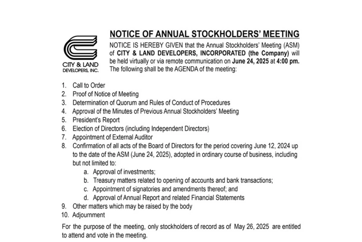 - City & Land Developers, Incorporated will be holding its annual meeting of stockholders virtually or via remote communication on June 24, 2025. Time, venue, eligibility, and details to participate are listed here.