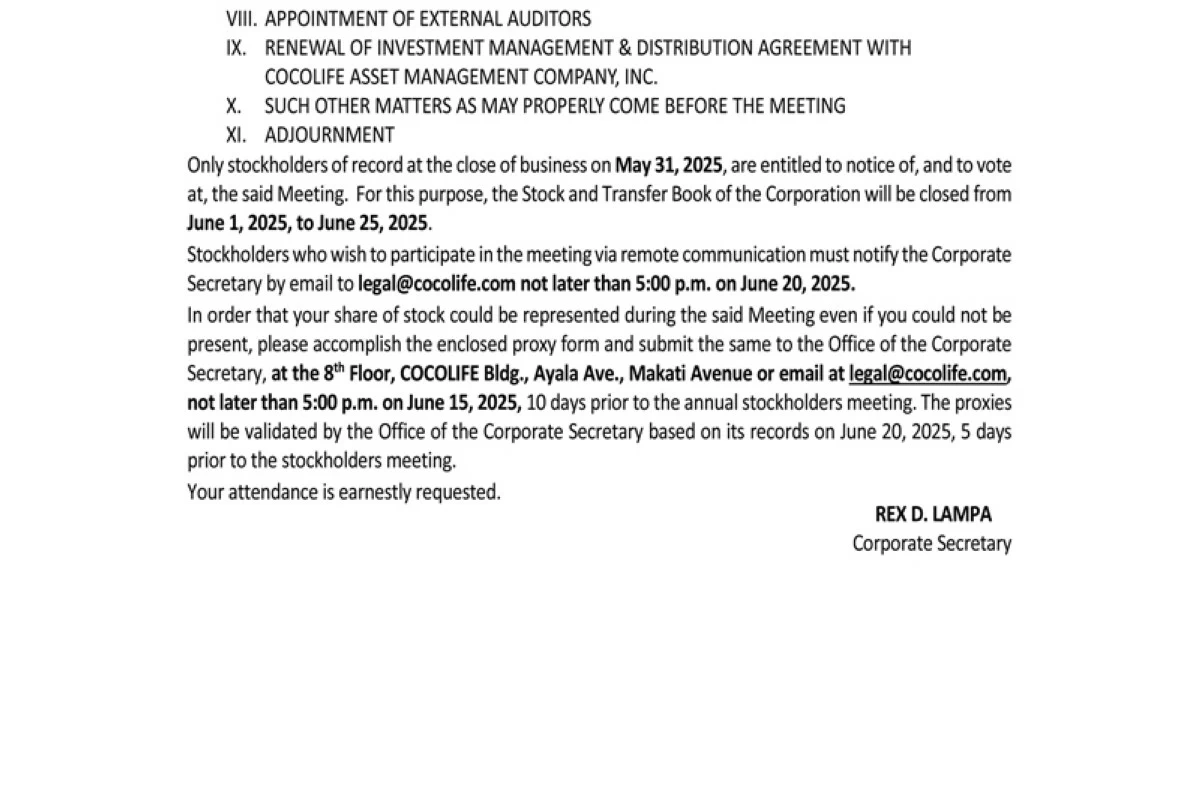 Cocolife Asset Management will be holding its annual meeting of stockholders on June 25, 2025, Wednesday, at the Executive Dining Lounge (EDL), 6th Floor Cocolife Bldg., 6807 Ayala Avenue, Makati City and via remote communication.