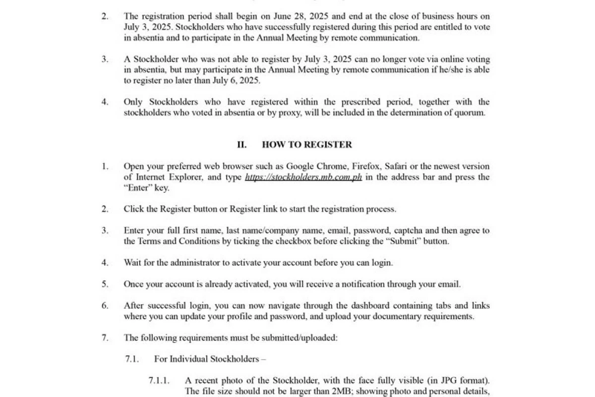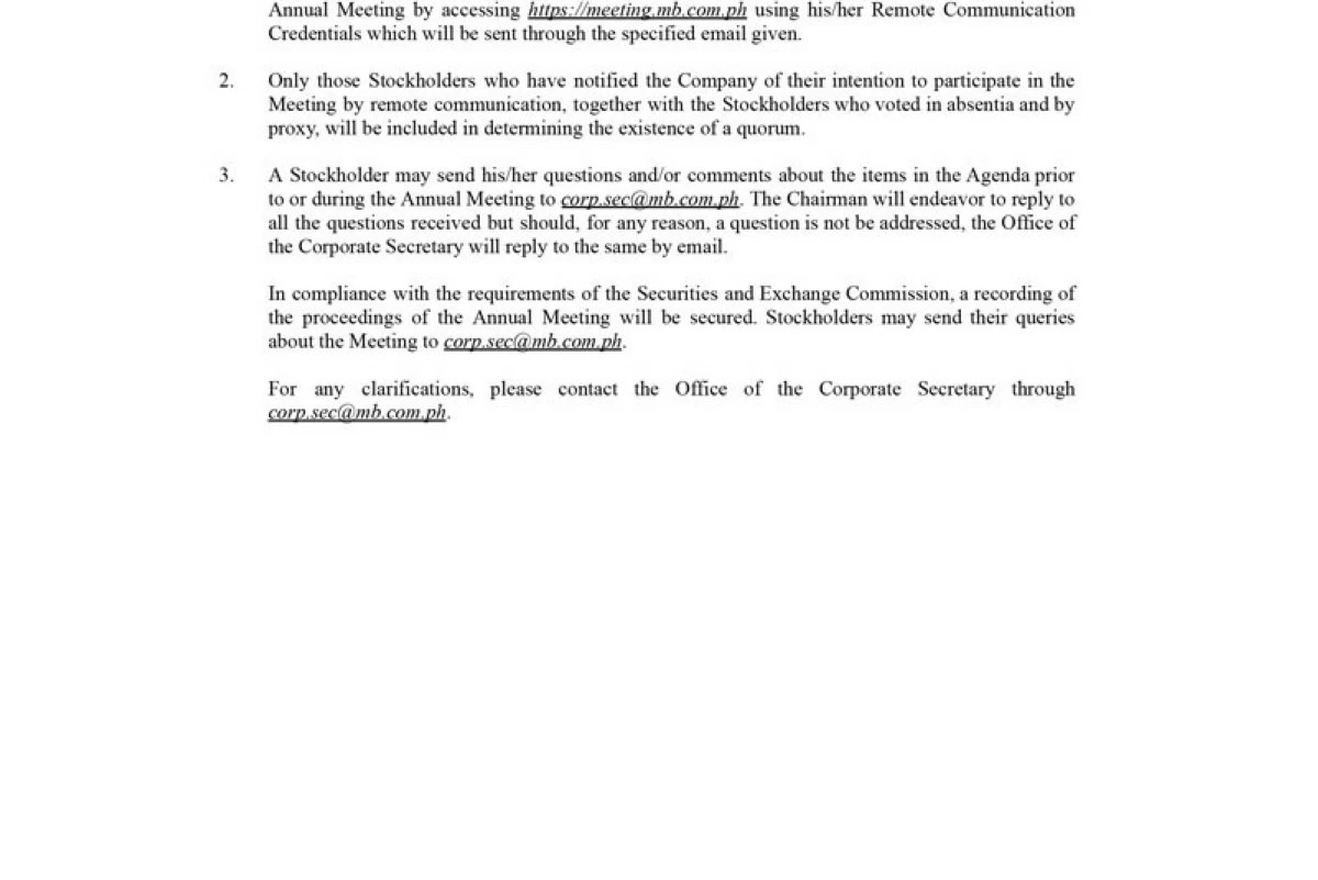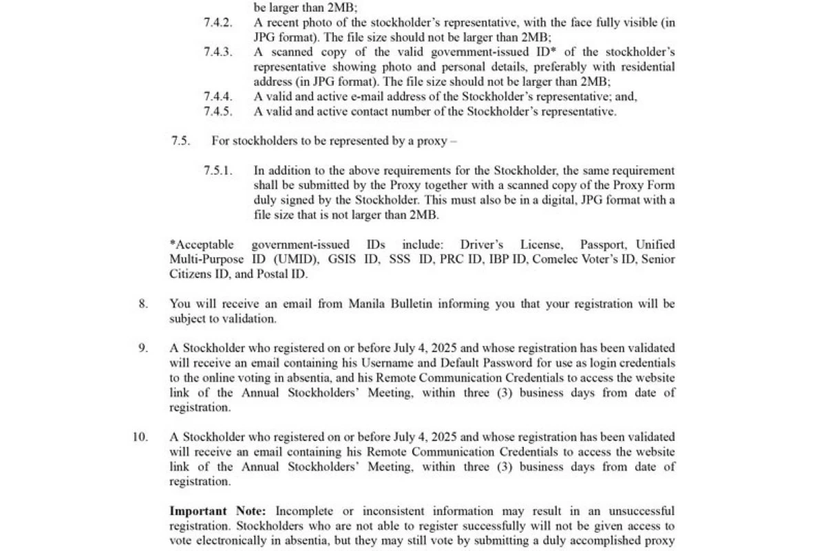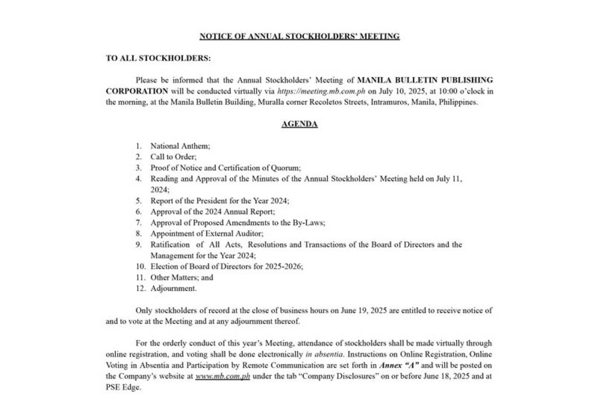 Manila Bulletin Publishing Corporation will be holding its annual meeting of stockholders virtually through https://meeting.mb.com.ph on July 10, 2025, at 10:00 AM, at the Manila Bulletin Building, Muralla corner Recoletos Streets, Intramuros, Manila.