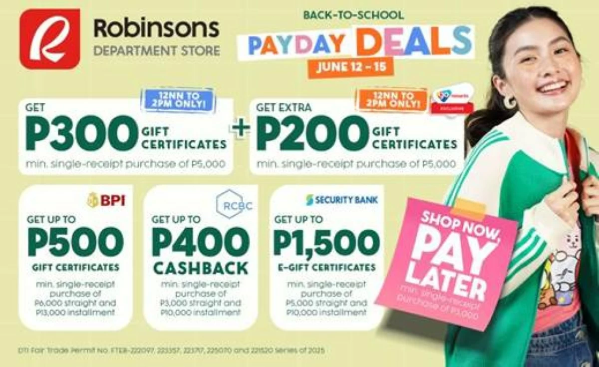 Robinsons Department Store is offering up to 50 percent savings on select items across all branches nationwide, . What’s more, from June 12 to 15 and 27 to 30, RDS is offering exclusive Payday Deals, featuring additional discounts and promotions. The Shop Now, Pay Later promo is giving away P300 gift certificates from 12 p.m. to 2 p.m., and P200 gift certificates for the rest of the day for a minimum of P5,000 single receipt purchase. You may also get an additional P200 gift certificate when you shop using your Go Rewards card.