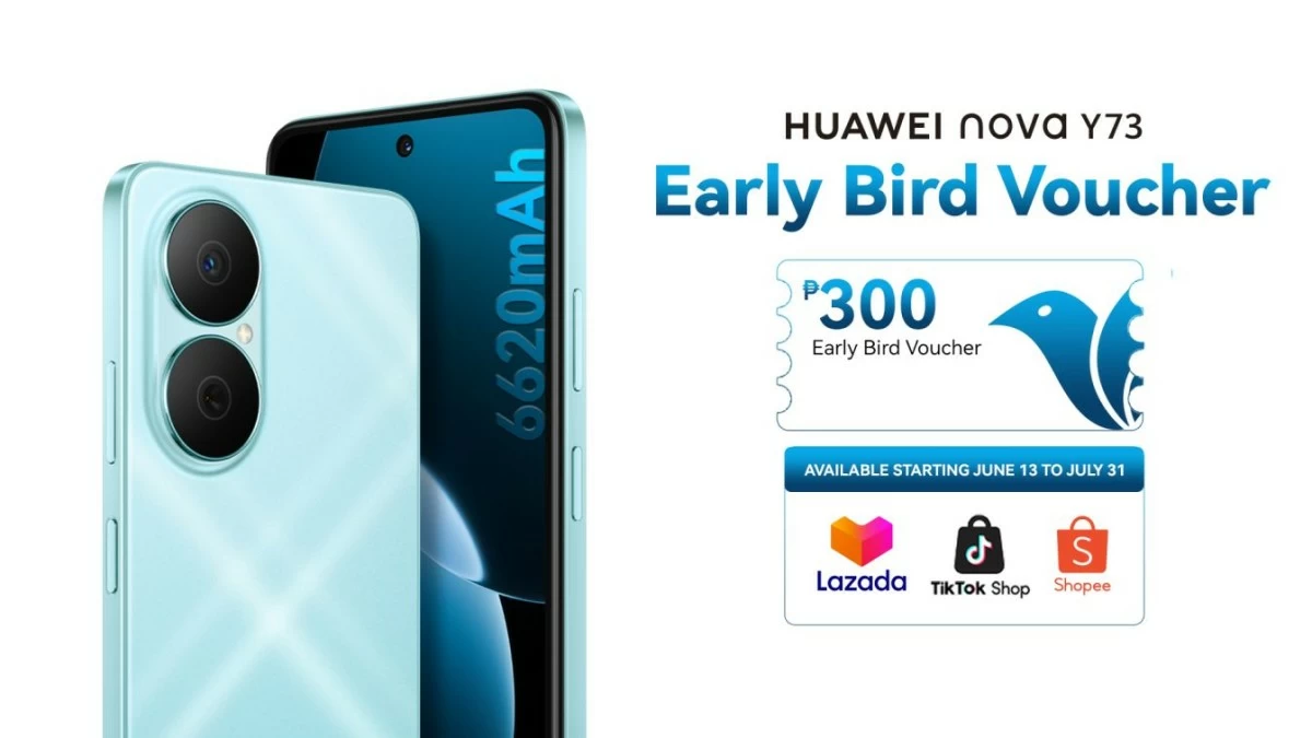 Score early bird vouchers worth PHP 300 for the HUAWEI nova Y73 from June 13 to July 31 on TikTok, Shopee, and Lazada.