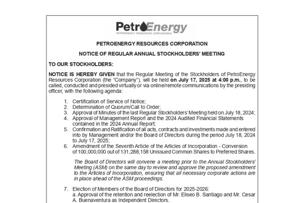 PetroEnergy Resources Corporation (PERC) will hold its Regular Annual Stockholders’ Meeting virtually on July 17, 2025, at 4:00 p.m. Only stockholders of record as of May 16, 2025 may vote and participate.