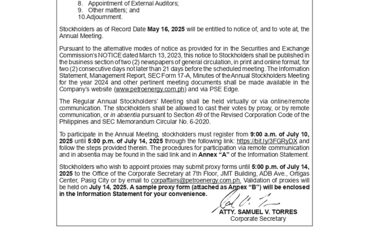 In accordance with SEC rules, this notice will be published in two widely circulated newspapers (print and online) at least 21 days before the meeting date. All relevant documents — including the Information Statement, Management Report, SEC Form 17-A, and 2024 meeting minutes — will be accessible via the company’s website and PSE Edge.