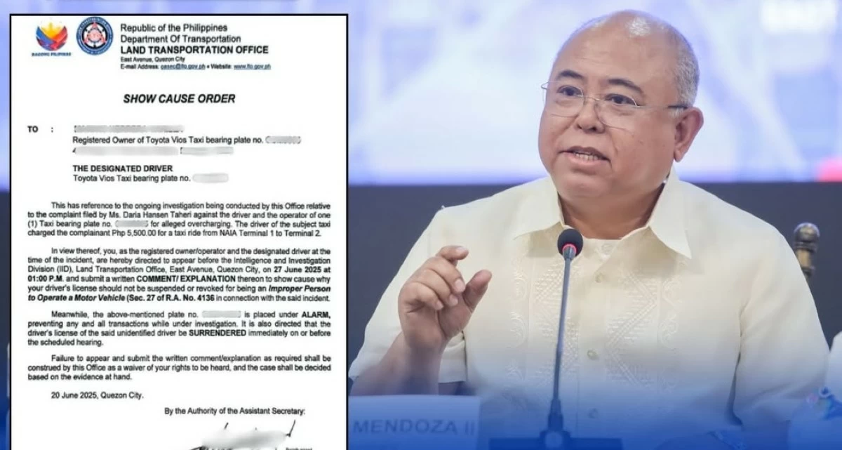 The issuance of the show cause order against the registered owner and the driver of the taxi came a few days after Department of Transportation (DOTr) Secretary Vince Dizon ordered the revocation of the driver’s license, and the franchise of a taxi due to overcharging at the NAIA.