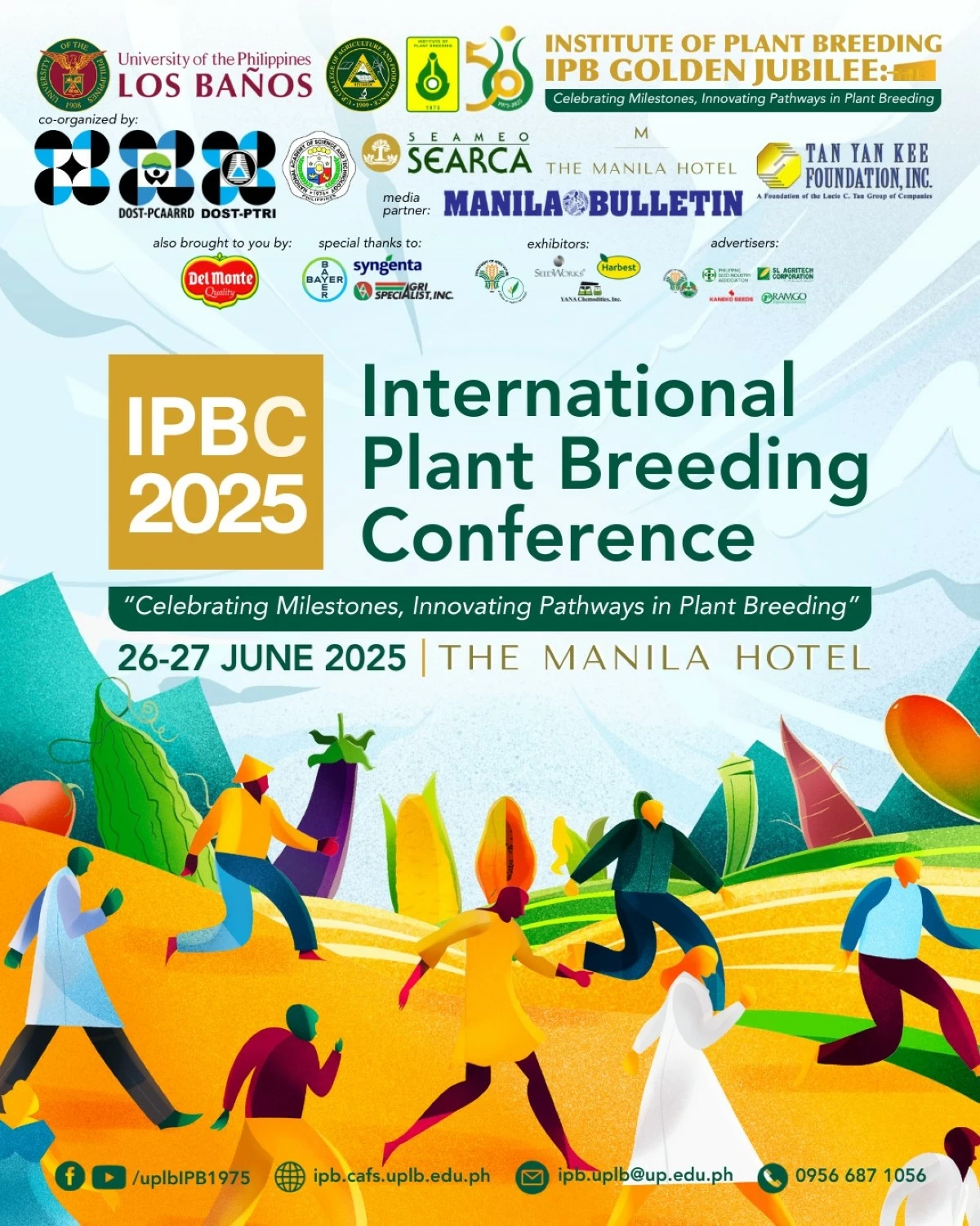 The expert-studded International Plant Breeding Conference is co-organized by UPLB, CAFS, DOST, DOST-PTRI, DOST-Philippine Council for Agriculture, Aquatic and Natural Resources Research and Development (DOST-PCAARRD), NAST, SEARCA, The Manila Hotel, and Tan Yan Kee Foundation, Inc.; sponsored by Del Monte, Philippines, Inc., Bayer CropScience Inc., Syngenta, and AgriSpecialist; and advertised by the Department of Agriculture–Bureau of Agricultural Research (DA-BAR), Philippine Seed Industry Association (PSIA), Pilipinas Kaneko Seeds Corp., SL Agritech, Ramgo, Mama Sita Foundation and Nicolie Enterprise.