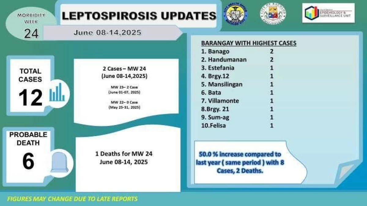 The first five fatalities were a 52-year-old drainage cleaner from Barangay Villamonte on Jan. 25, a 47-year-old man from Barangay Banago on April 20, a 17-year-old man from Barangay Bata in May, a 43-year-old man from Barangay 2 on June 3, and a 57-year-old woman from Barangay Handumanan on June 9.