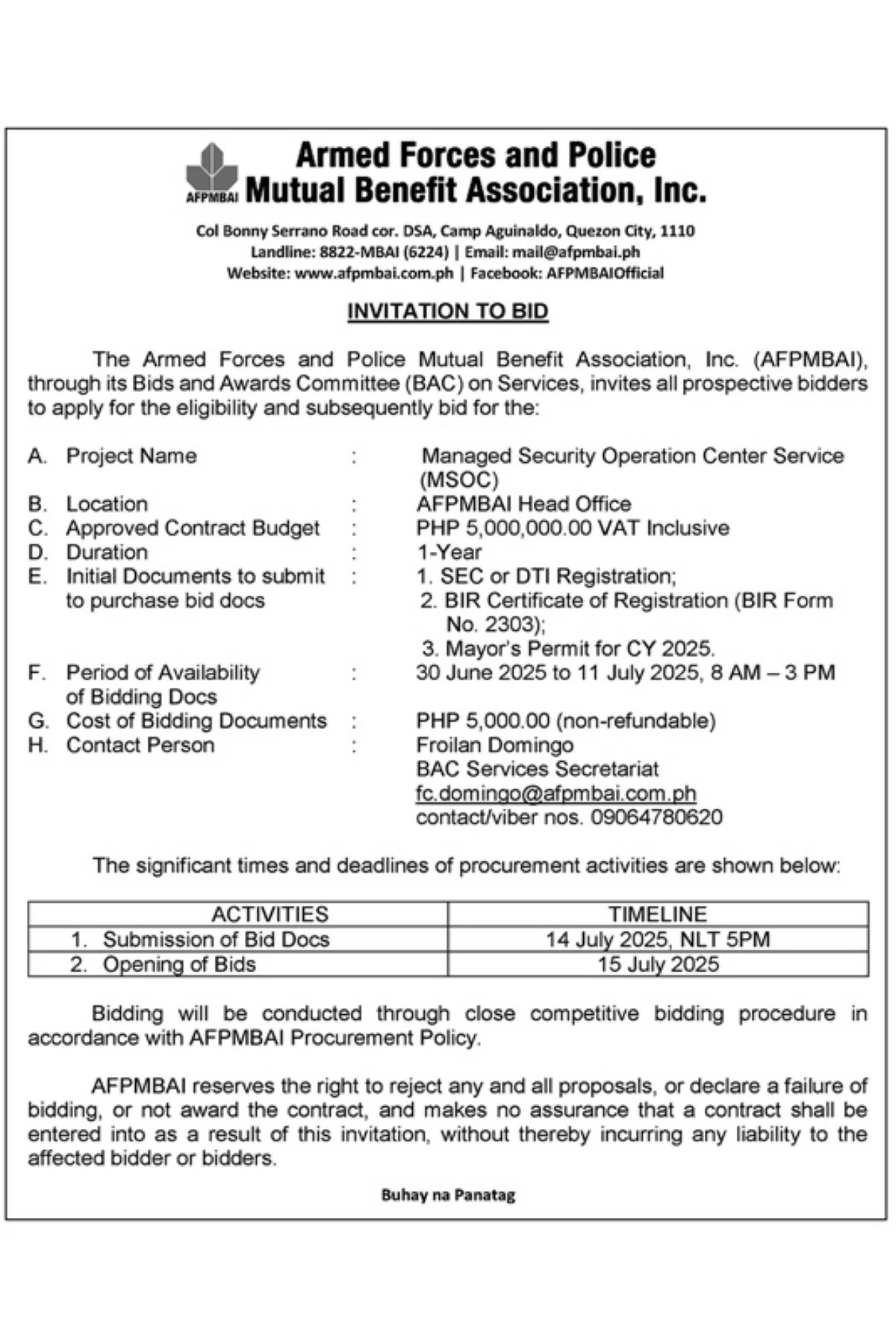 The Armed Forces and Police Mutual Benefit Association, Inc. (AFPMBAI), through its Bids and Awards Committee (BAC) on Services, invites all prospective bidders to apply for the eligibility and subsequently bid for the Managed Security Operation Center Service for AFPMBAI.