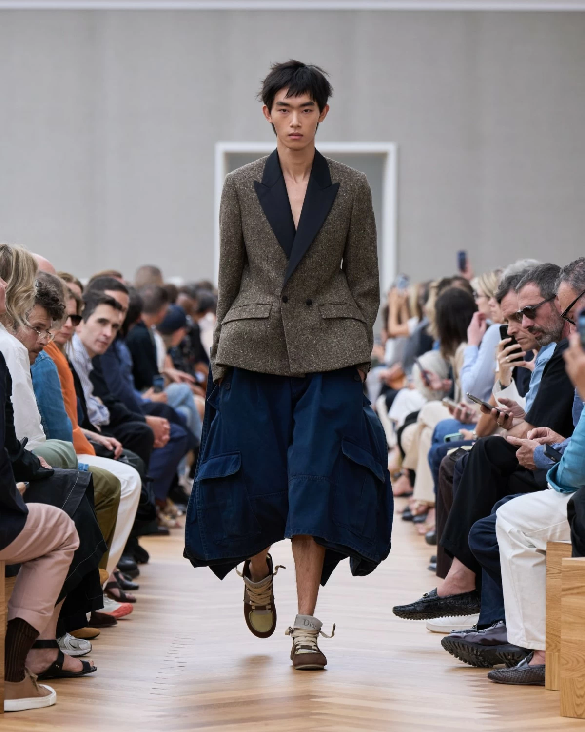 Gracing the runway were Bar jackets in Donegal tweeds, regimental neckties, and 18th- to 19th-century waistcoats articulated with ease and modernity by pairing them with denim, chinos, and sneakers. Among the standout elements of Jonathan’s inaugural collection was his couture treatment of cargo shorts, reimagined in bold and voluminous silhouettes. Some of the pieces are also decorated with roses, little embroideries, and Diorette charms, adding a touch of rococo feel to the clothes.