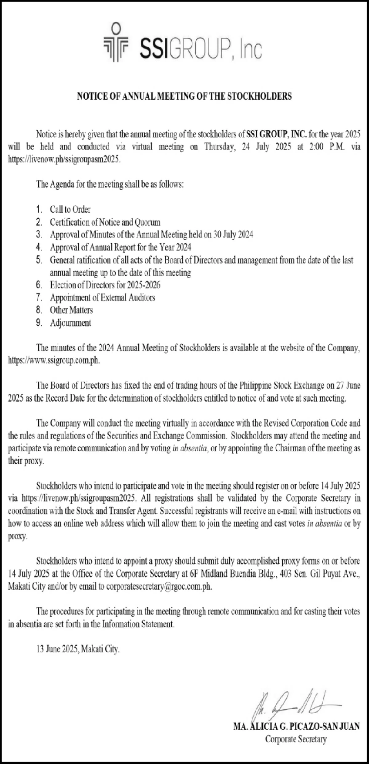 SSI Group, Inc. will be conducting its annual meeting of stockholders on July 24, 2025, Thursday, at 2:00 p.m. via virtual meeting accessible at https://livenow.ph/ssigroupasm2025 target=_blank>https://livenow.ph/ssigroupasm2025.
