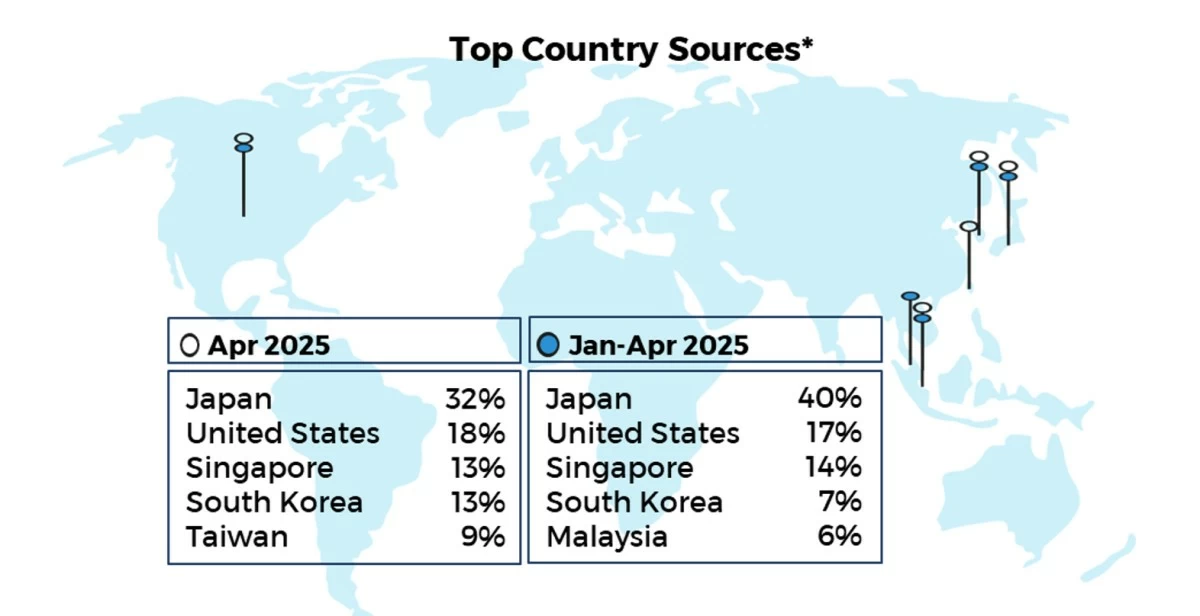 Manufacturing accounted for the largest share of investments in April at 47 percent—nearly half of the total. It was followed by financial and insurance activities and real estate, each receiving 16 percent, while the remaining 20 percent went to other industries.