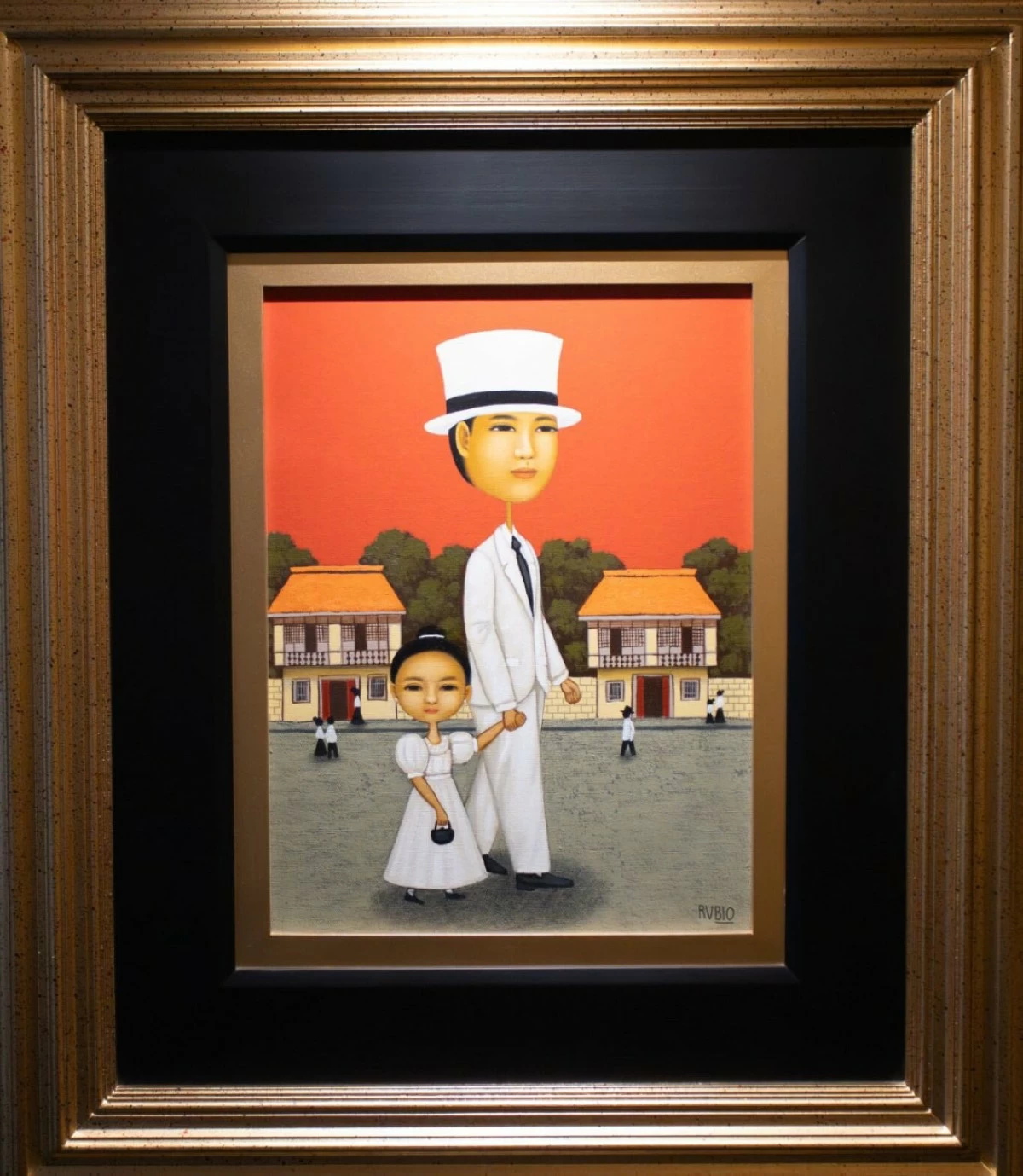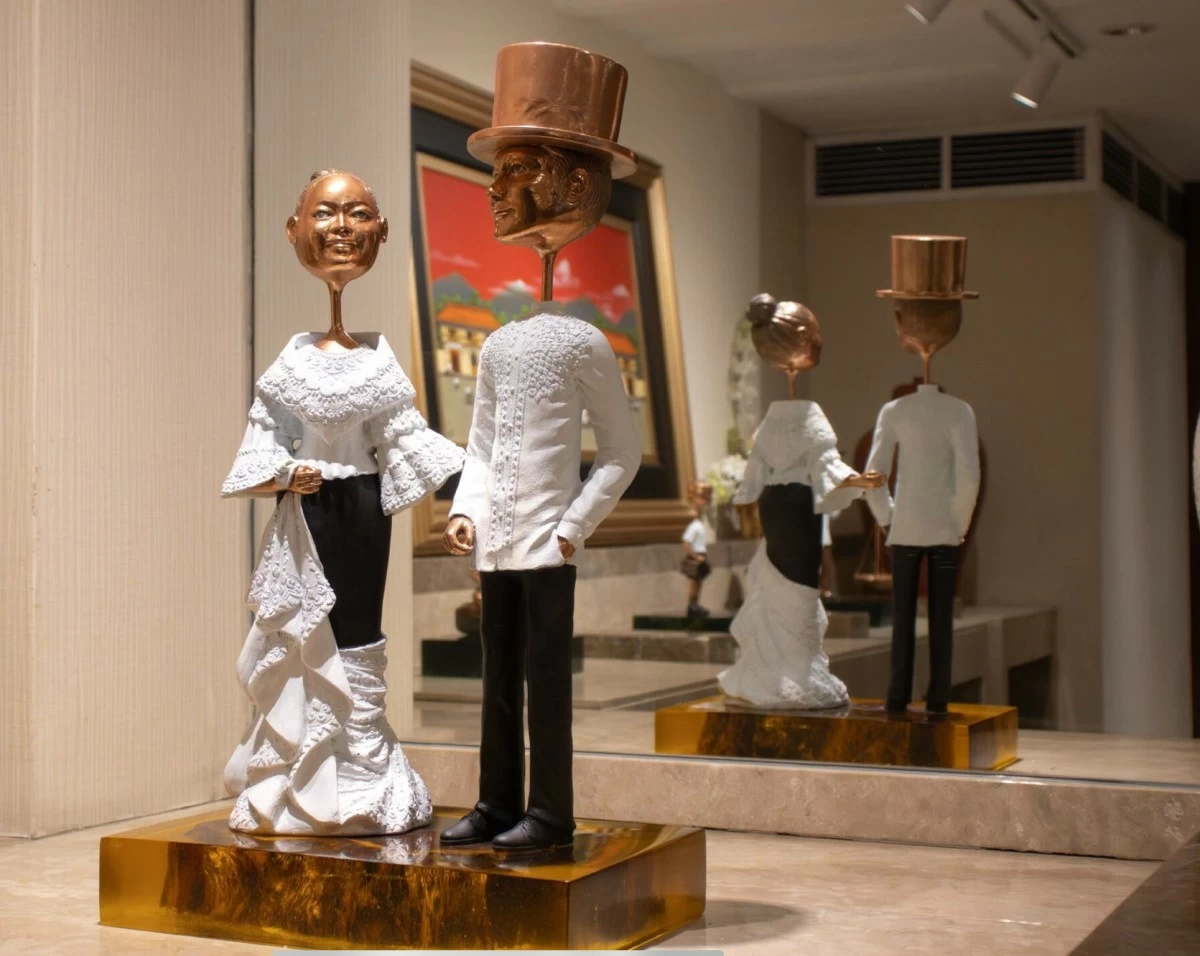 The exhibit featured stylized portraits of Filipinos in colonial attire by Dominic Rubio, serving as a visual thread through the show. Known for his distinct, elongated figures, Dominic’s work evokes nostalgia and national pride. A native of Paete, Laguna and a commercial art graduate from the University of Santo Tomas, he transitioned from advertising to fine art and has since exhibited at Sotheby’s, Christie’s and in international civic spaces such as the Philippine Embassy in Washington, D.C.