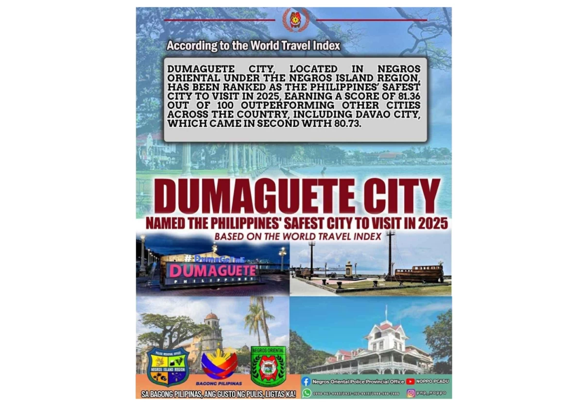 BACOLOD CITY – The Police Regional Office-Negros Island Region (PRO-NIR) cited the recent declaration by the World Travel Index that Dumaguete City in Negros Oriental is the Safest City to Visit in the Philippines in the first half of 2025.