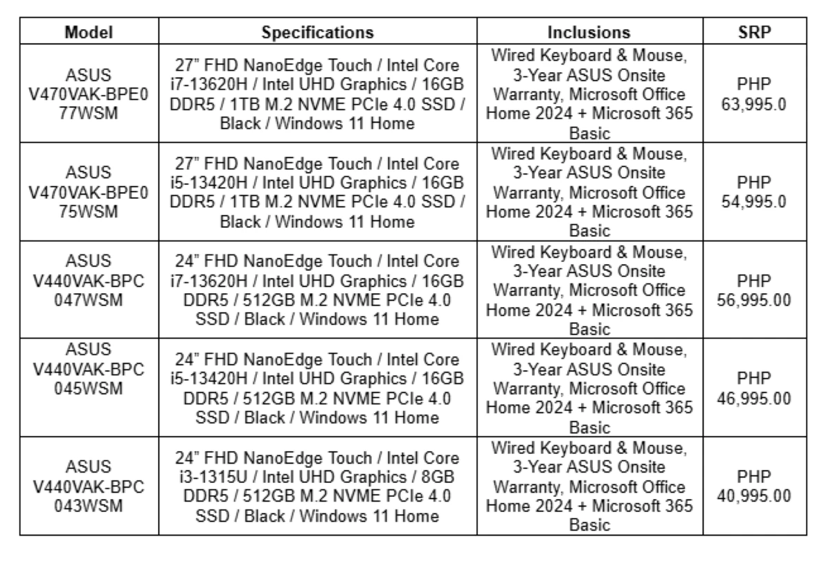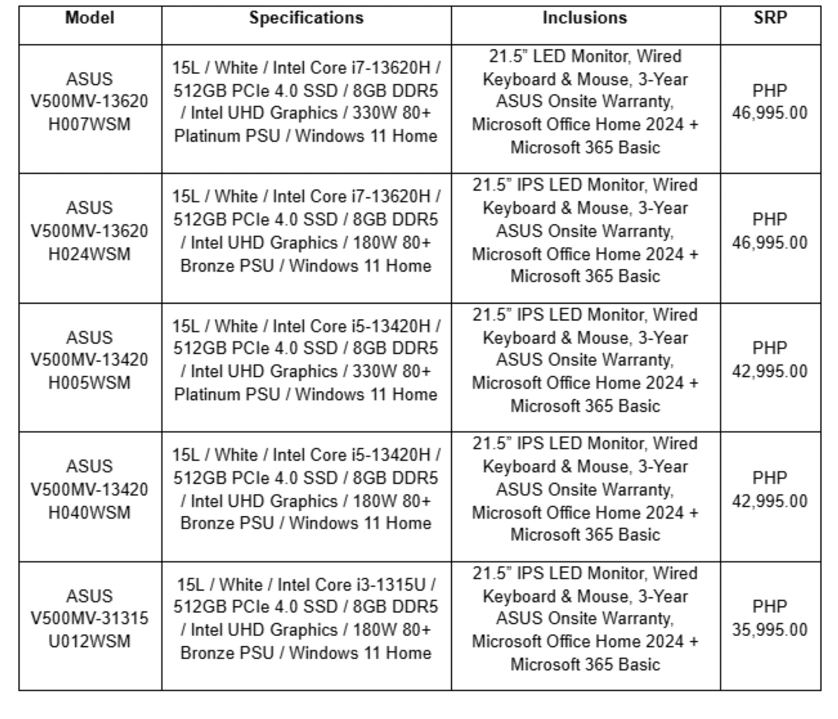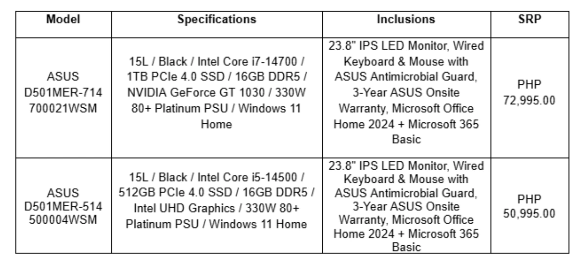 The ASUS V500 and D5 Mini Towers come with a monitor, a set of wired keyboard and mouse, and a three-year ASUS Onsite Warranty. On the other hand, the ASUS V400 AIO will include a wired keyboard and mouse combination, along with the same reliable three-year warranty and onsite service. Inquire at the nearest ASUS Exclusive Store to know more about these products.