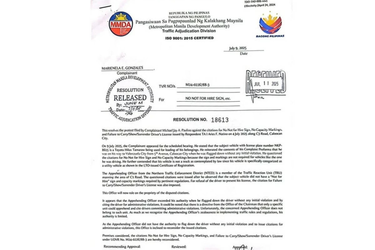 In response, the MMDA released Resolution No. 18613, which puts on record the agency’s findings in the driver’s favor, acknowledging that the MMDA’s Apprehending Officer (AO) acted beyond his authority.
