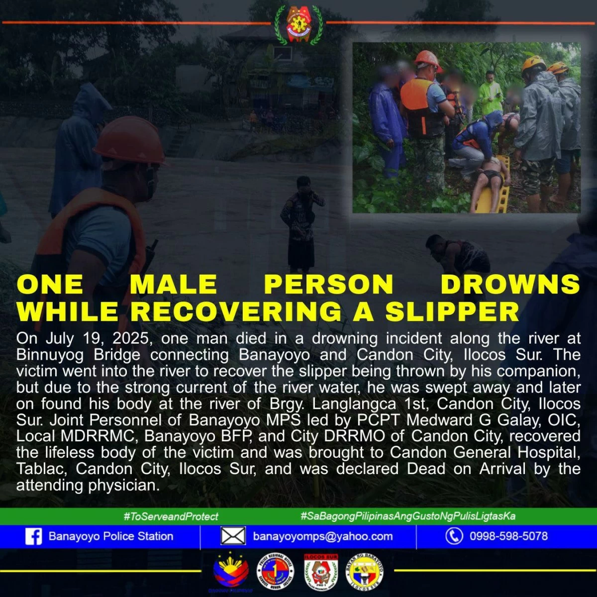 BANAYOYO, Ilocos Sur – A 21-year-old construction worker drowned while retrieving his slippers thrown by his co-worker into a river as a practical joke at the height of tropical storm “Crising” here on Saturday, July 19.