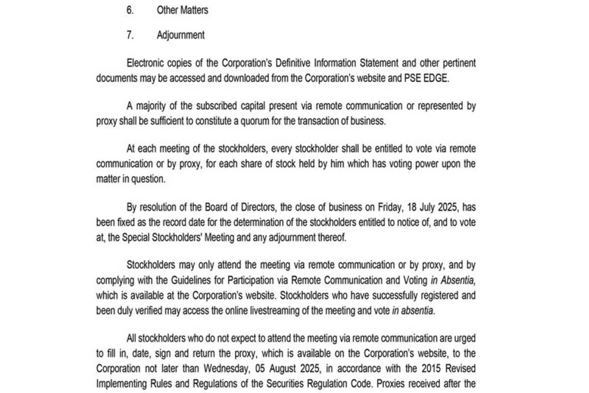 - Sta. Lucia Land Inc. will be holding its annual stockholders' meeting on August 12, 2025. Details to participate are listed here.