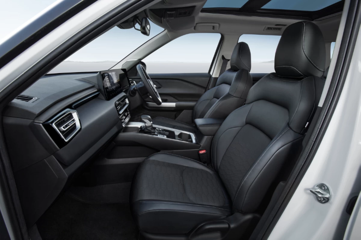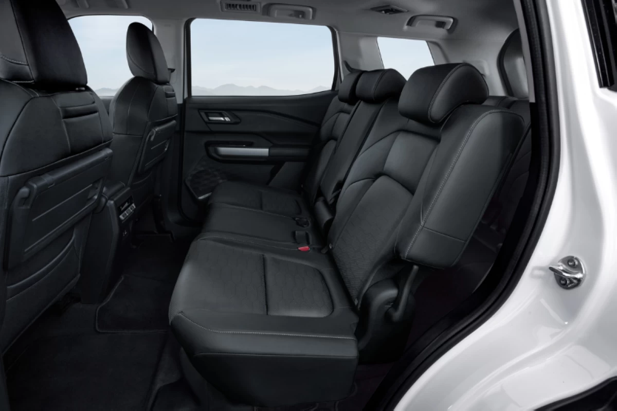 The cabin combines upscale materials with family-oriented practicality. Higher trims are equipped with a 12.3-inch touchscreen infotainment system compatible with Android Auto and Apple CarPlay, ambient lighting with 64 color options, and a panoramic sunroof. The center console retains tactile switches similar to those in the Xpander Cross. Seating is flexible, with a 60:40 second-row bench that includes a fold-down armrest with tray table, and a 50:50 split third row that folds flat. Air-conditioning vents are available across all three rows, complemented by USB-A and USB-C ports throughout the interior.