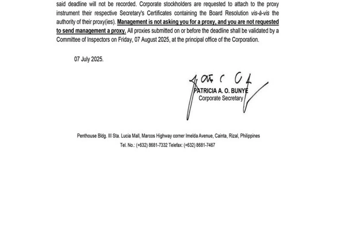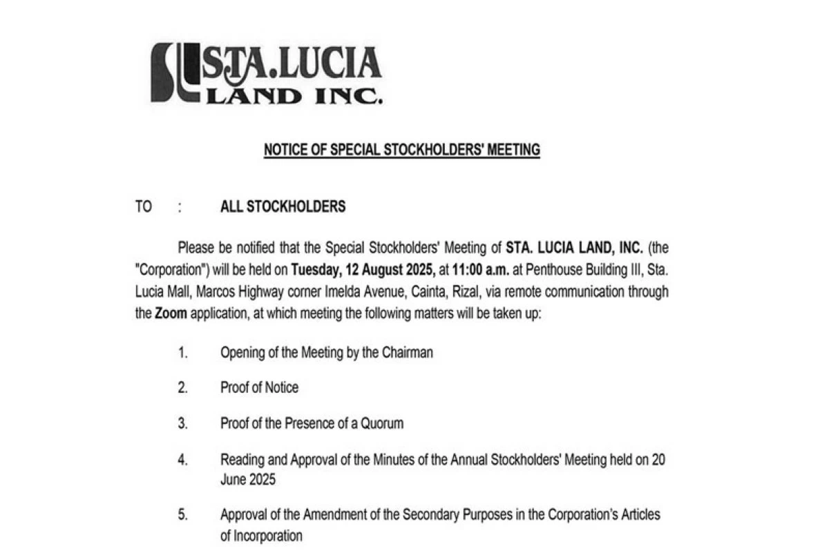 Sta. Lucia Land Inc. will be conducting its annual stockholders' meeting on August 12, 2025, at 11:00 AM at the Penthouse Building III, Sta. Lucia Mall, Marcos Highway corner Imelda avenue, Cainta, Rizal via remote communication through Zoom application.