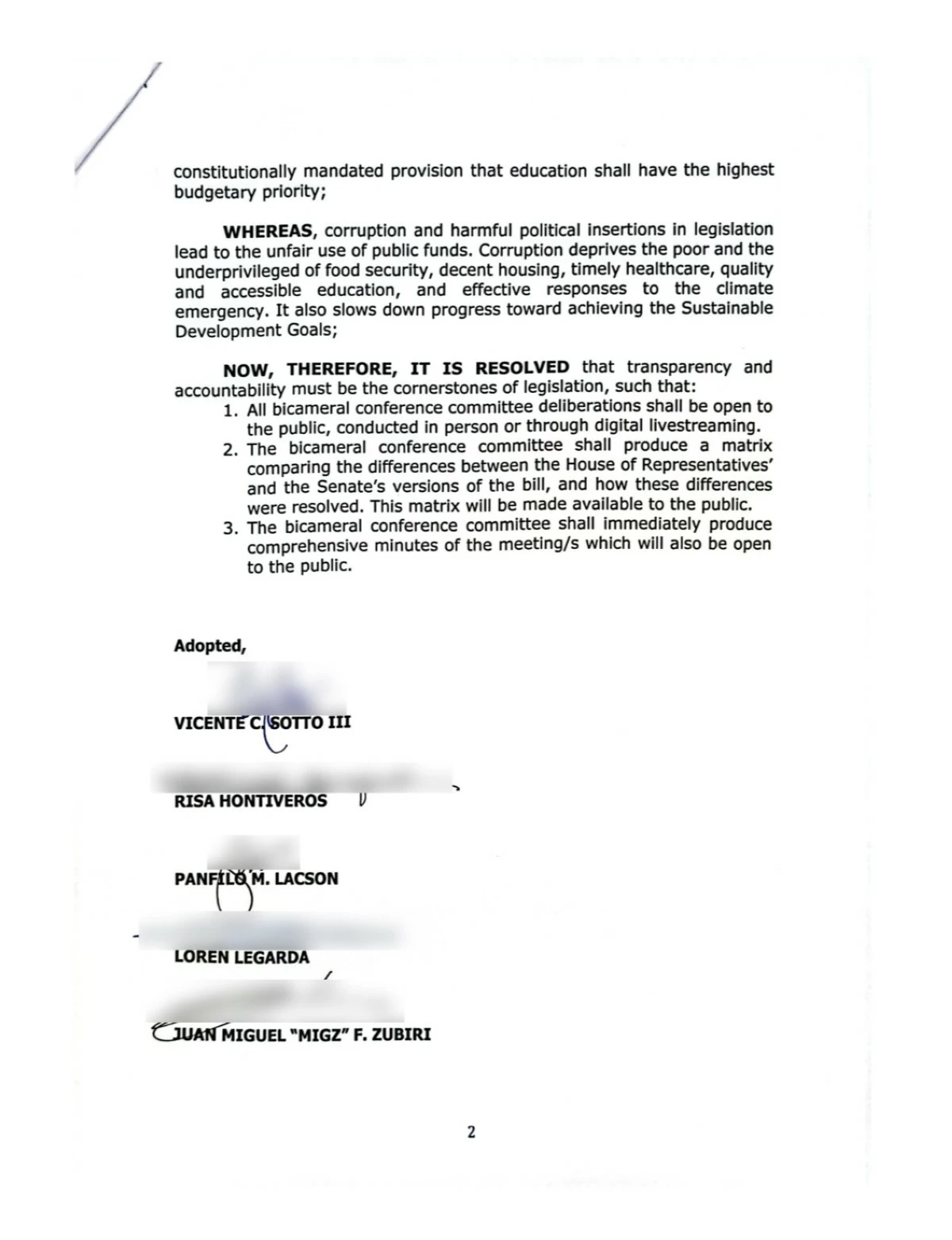- The seven senators—Vicente "Tito" Sotto III, Juan Miguel "Migz" Zubiri, Risa Hontiveros, Panfilo "Ping" Lacson, Loren Legarda, Paolo "Bam" Aquino IV and Francis "Kiko" Pangilinan—pushed that all bicameral deliberations be open to the public, either in person or via digital livestream.