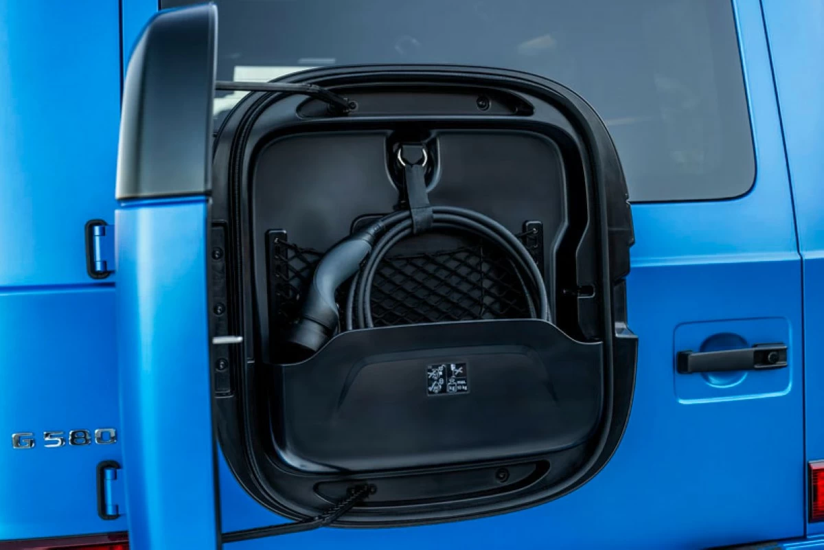 The electric G580 looks just like the other ICE G-Class models with just some very subtle changes. These include closed-off grille (because it no longer needs a large radiator to cool an engine), a slightly raised hood, air curtains in the rear wheel arches, and unique alloy wheels. Behind is also a squared off spare tire cover which actually houses the charging cable.