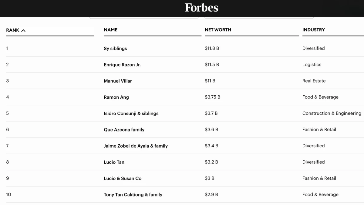 The Sy siblings, heirs to the SM group, held onto the top spot on the 2025 Forbes list of the Philippines’ 50 Richest, but their combined fortune fell by $1.2 billion to $11.8 billion. Meanwhile, Razon’s net worth saw a modest increase to $11.5 billion, placing him a mere $300 million behind the top spot.