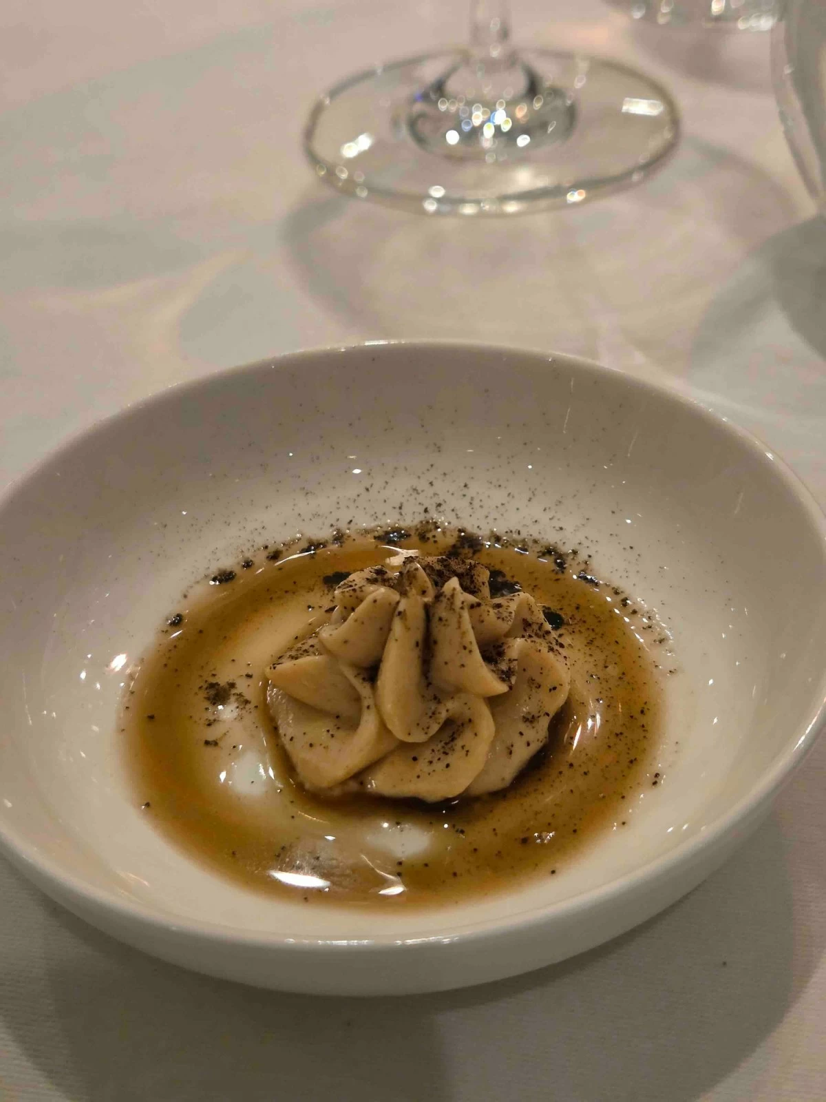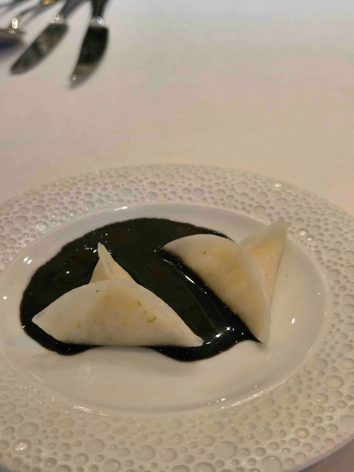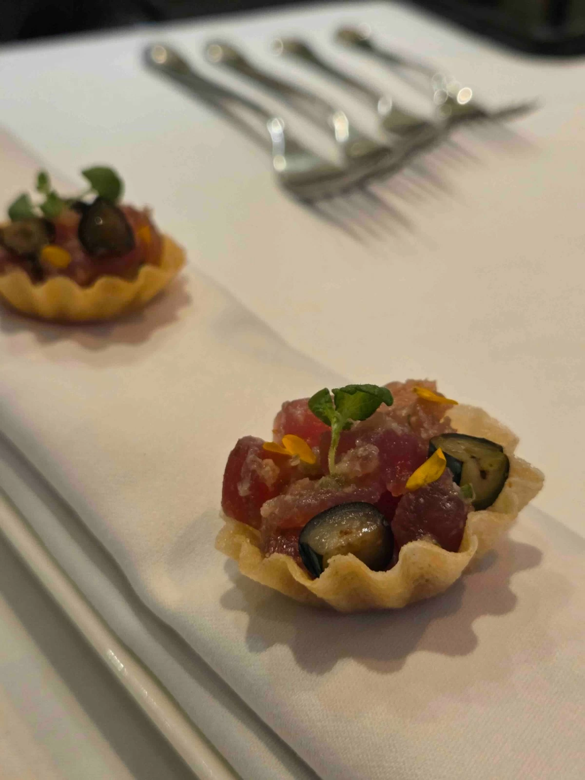 The evening began with a trio of amuse-bouche that set the tone of the tasting menu. The Squid Tartare over Daikon Radish was a contrast in color and texture with the tender squid encased in a thin layer of crisp radish over squid ink sauce. The Spiced Bluefin Tuna Tartlet delivered a balance of delicate heat and fresh tuna, while the Foie Gras Cream with Mushroom’s Essence offered a luxurious finish.