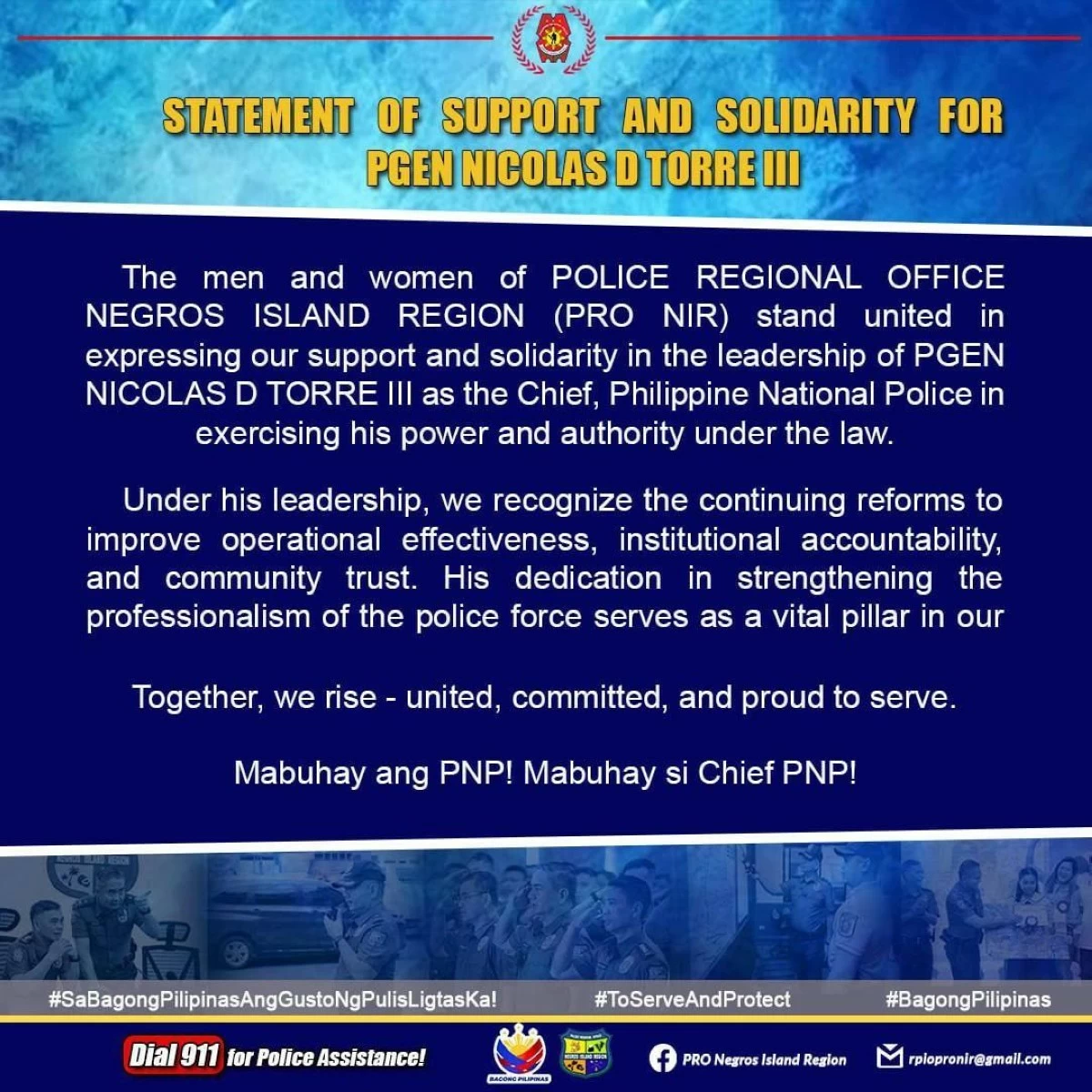 BACOLOD CITY – The Police Regional Office-Negros Island Region (PRO-NIR) expressed support to the leadership of Philippine National Police (PNP) chief Gen. Nicolas Torre III amid a controversy with the National Police Commission (Napolcom) involving two ranking police generals.