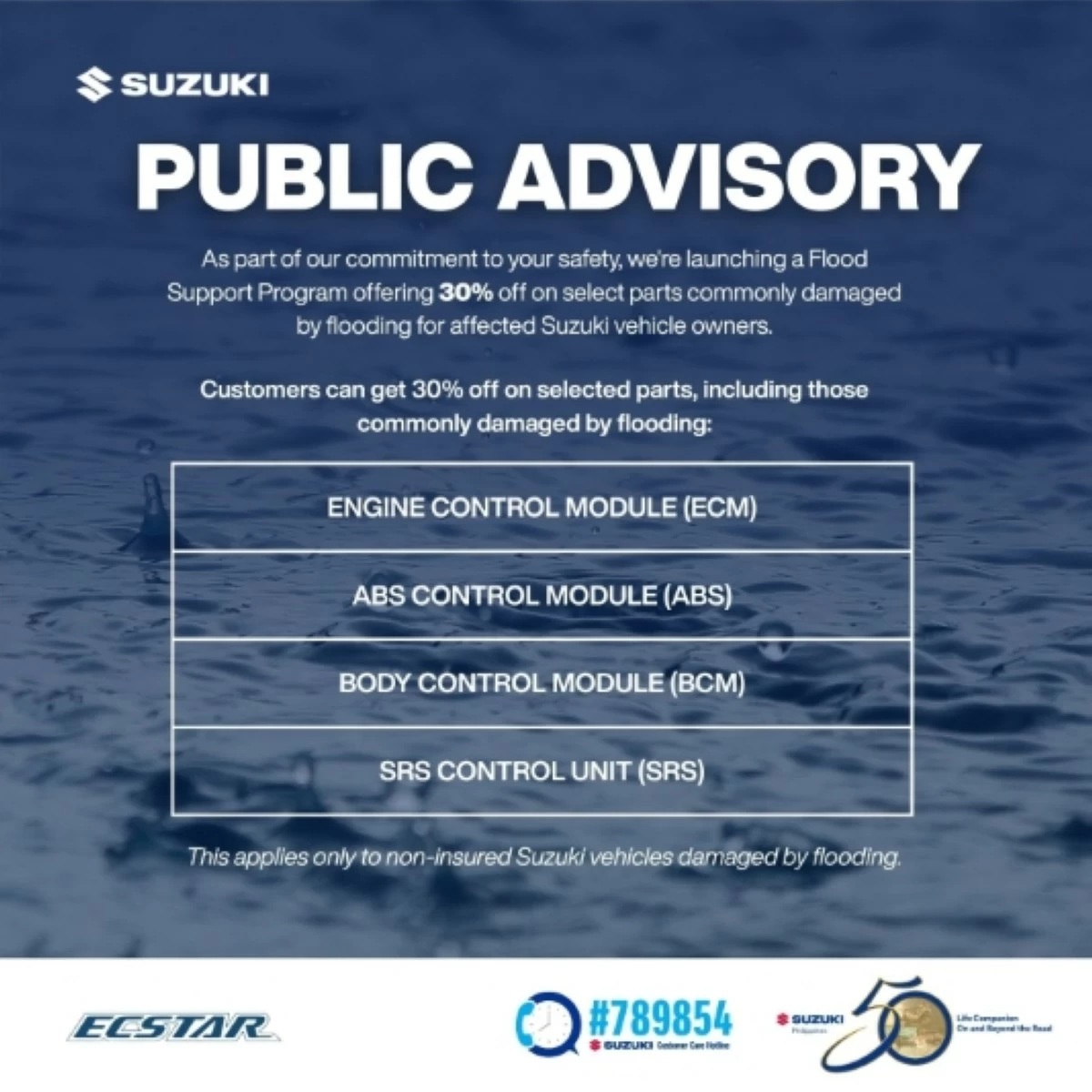 Beyond immediate relief, Suzuki Philippines also launched a Flood Support Program to assist owners of Suzuki vehicles damaged in the floods. The program offers a 30% discount on select control modules, including the Engine Control Module (ECM), ABS Control Module, Body Control Module (BCM), and SRS Control Unit. The offer applies to non-insured Suzuki vehicles, providing a cost-effective option for safe repairs and continued mobility.
