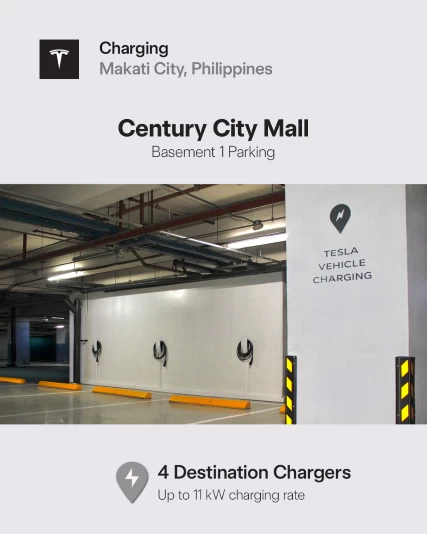 Tesla's network also includes Supercharger sites at Uptown Mall Taguig, SM Mall of Asia in Pasay, and Shangri-La Plaza in Mandaluyong, operating at ₱19 per kWh. Eastwood Mall in Quezon City hosts Destination Chargers as well, priced at ₱16 per kWh.