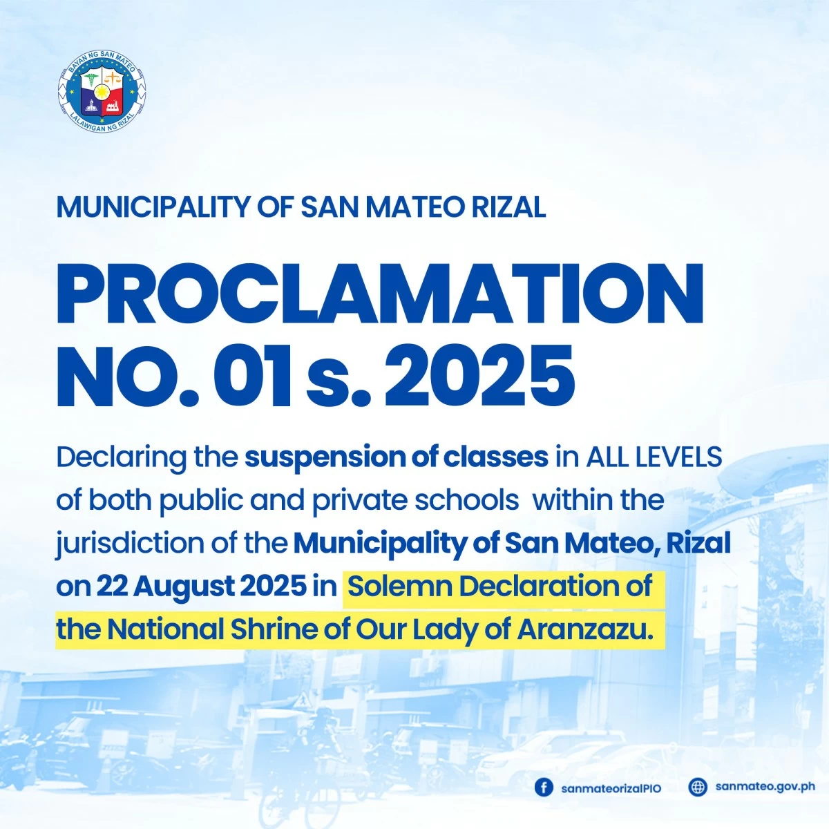 The San Mateo municipal government said Acting Municipal Mayor Mary Grace Diaz signed Proclamation No. 01, Series of 2025, declaring the suspension of classes in all levels of both public and private schools in the entire municipality on Friday, August 22.