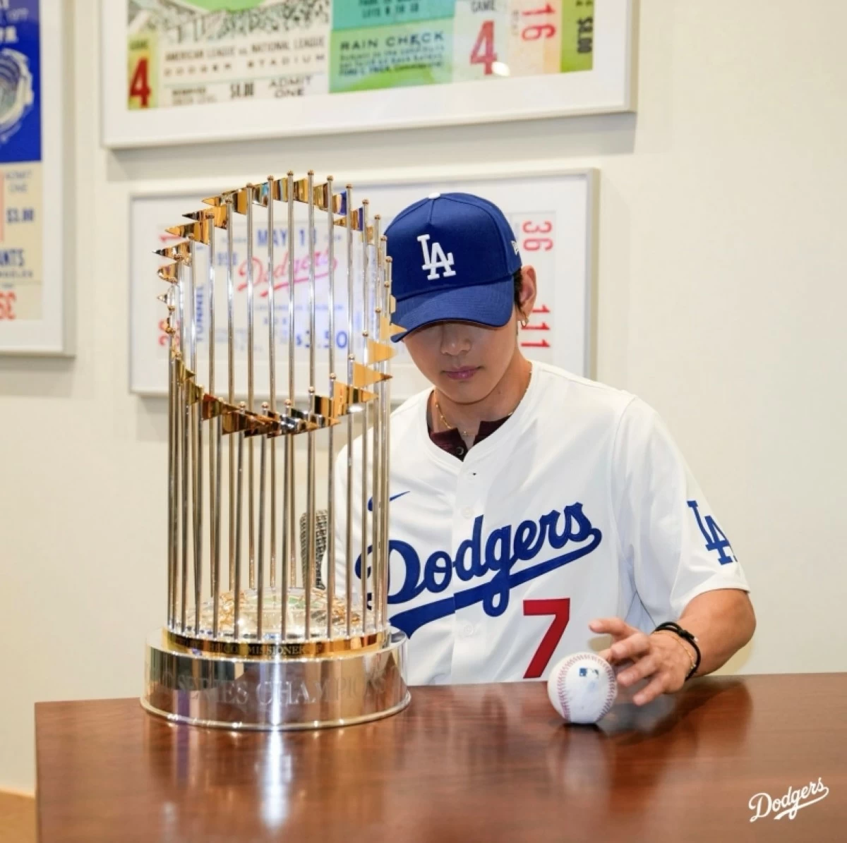 V, wearing an LA Dodgers uniform, threw the first pitch at Yoshinobu Yamamoto